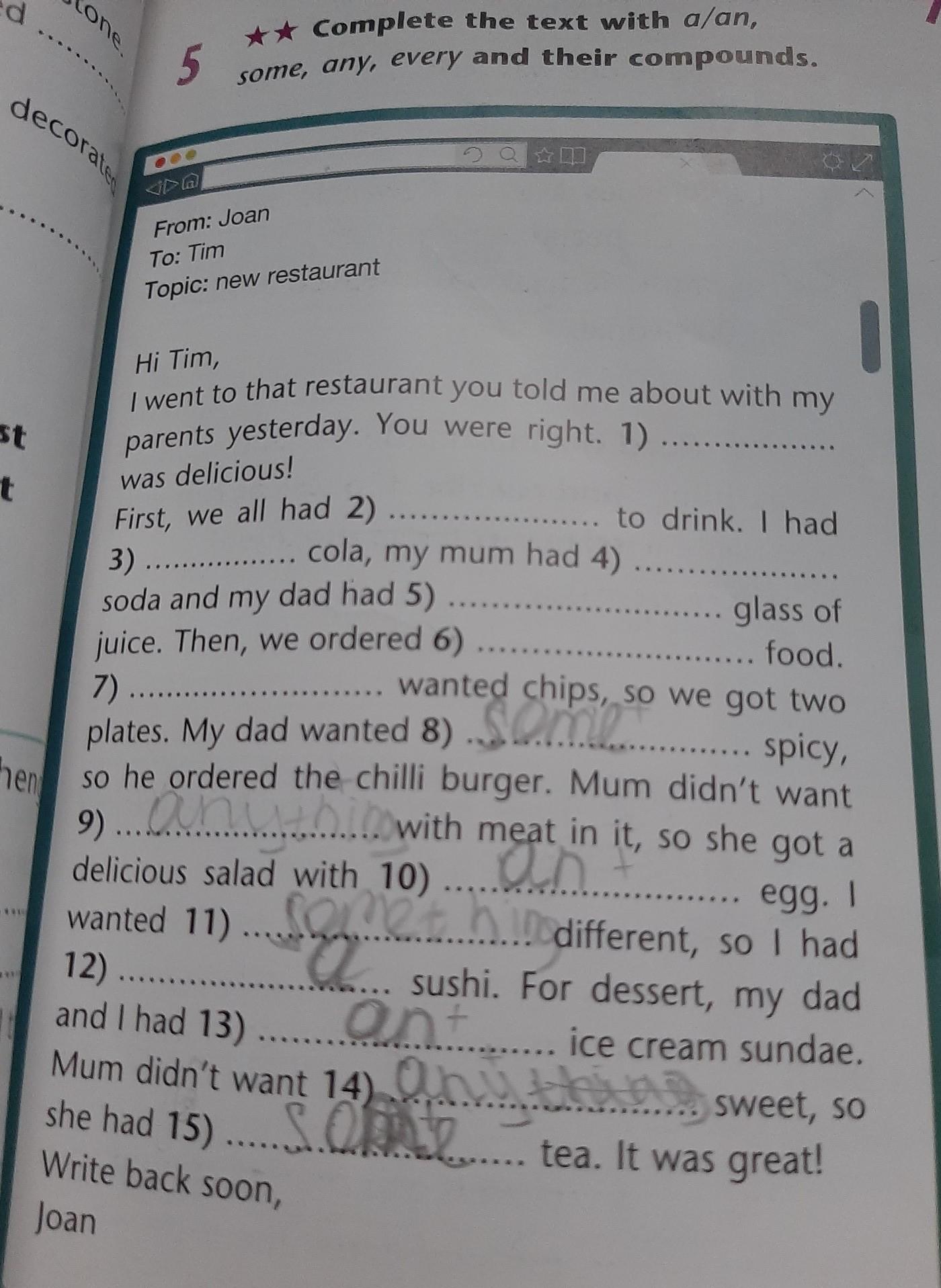 ...ston 5 ** Complete the text with a/an, some, any, every and their compounds. decor From: Joan To: Tim Topic: new restaurant it Hi Tim, ast I went to that restaurant you told me about with my parents yesterday. You were right. 1) ..... ent ........ - was delicious! First, we all had 2) 3) ........ soda and my dad had 5).... juice. Then, we ordered 6). 7) ........ to drink. I had cola, my mum had 4) ..... glass of food. Ineh , plates. My dad wanted 8).Sa chips, so we got two .... spicy, Sound an. .... egg. I eh different, so I had U sushi. For dessert, my dad leted So he ordered the chilli burger. Mum didn't want 9) .........with meat in it, so she got a delicious salad with 10) wanted 11) 12) ....... and I had 13) .......on....... ice cream sundae. she had 15) .......... tea. It was great! Mum didn't want 14) Oct ... Write back soon, sweet, so Flo Joan