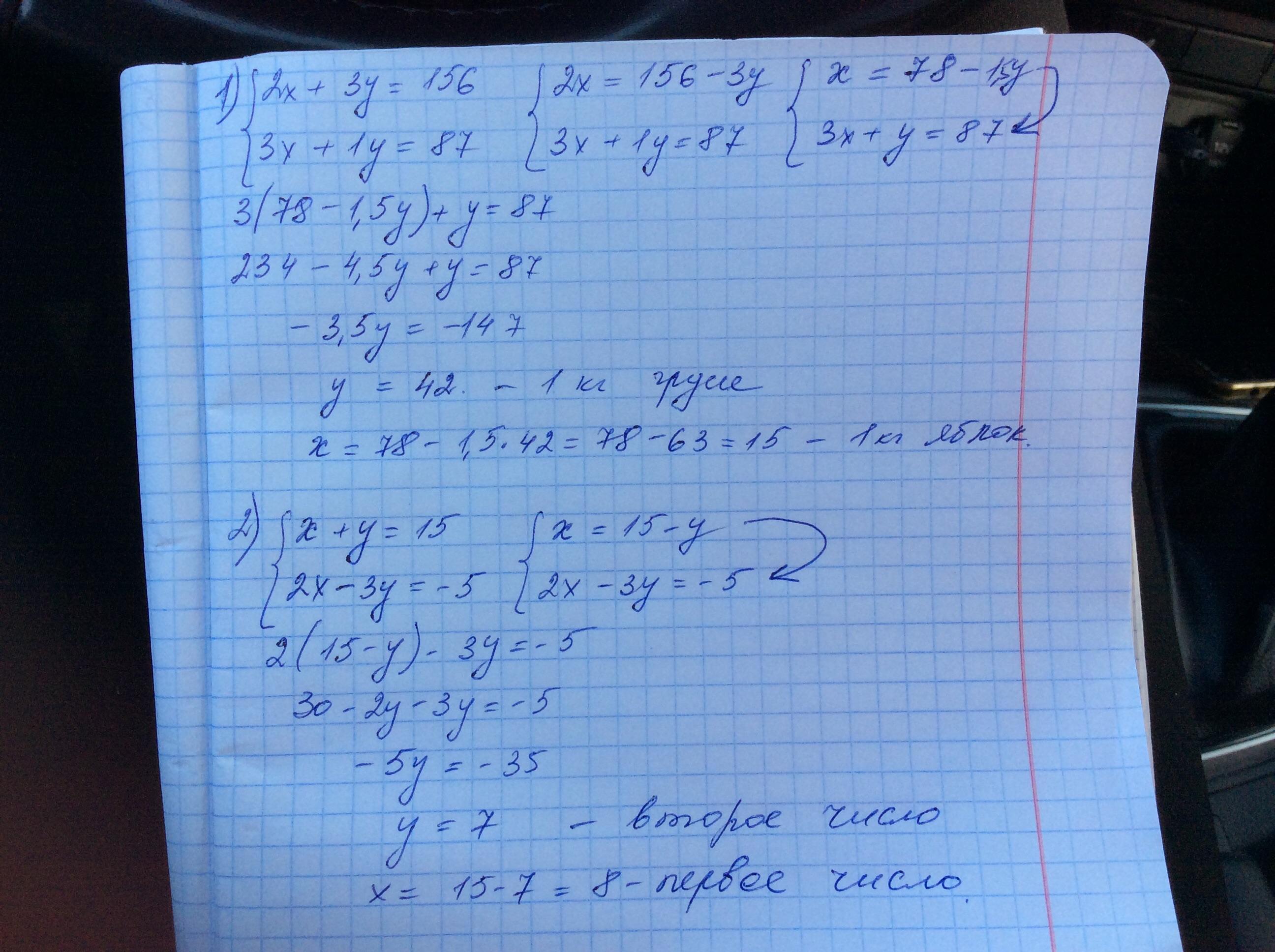1) За 2 кг яблук і 3 кг груш заплатили 156 грн, а за 3 кг яблук і 1 кг груш – 87 грн. Скільки коштує 1 кг яблук та 1 кг груш? 2) Сума двох чисел дорівнює 15, а різниця між удвоєним здобутком першого числа і потроєним здобутком іншого число дорpівнює-5. Знайти ці числа.