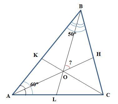 В треугольнике ABC угол A равен 60 градусов, а угол B равен 50 градусов. AH, CK и BL - биссектрисы, проведенные к сторонам треугольника и пересекающиеся в точке O.