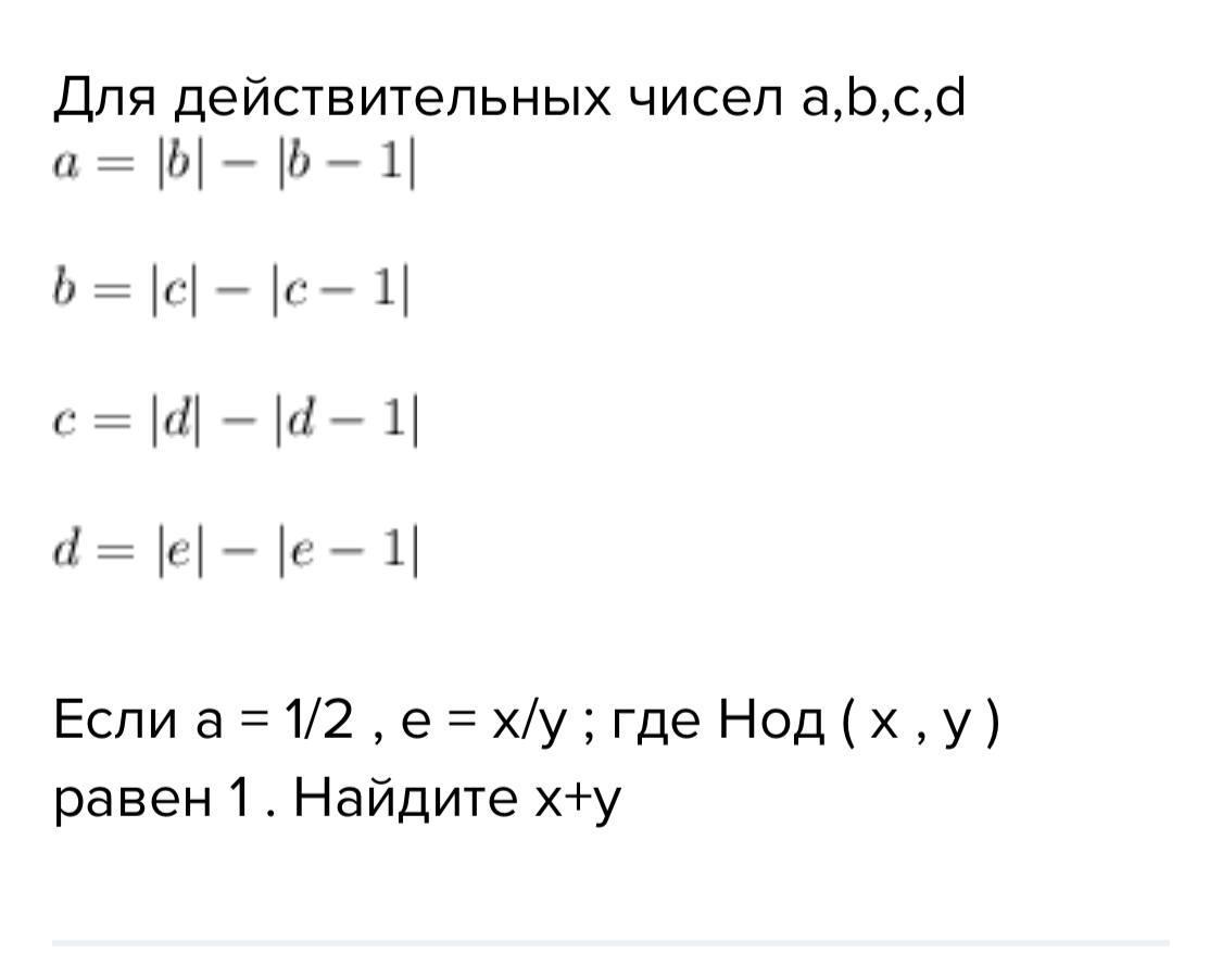 Рассуждая аналогично, находим с=7/8; d=15/16; e=31/32. Поскольку по условию x и y взаимно просты, x=31; y=32; x+y=63.