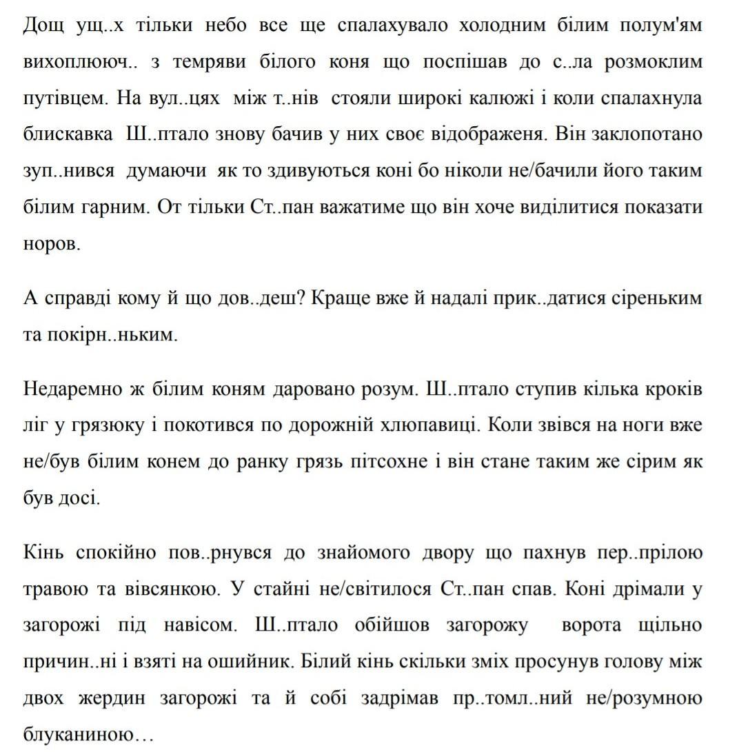 Дощ ущух; вихоплюючи з темряви; до села розмоклим; на вилицях між тинів; шептало знову; заклопотано зупиився; тільки Степан; що доведеш; прикидатися сіреньким і покірним; шептало ступив кілька кроків; не був (не з дієсловами пишеться окремо); спокійно повернувся; перепрілою травою; не світилося; Степан; шептало; причинені; притомлений не розумною блуканиною.
