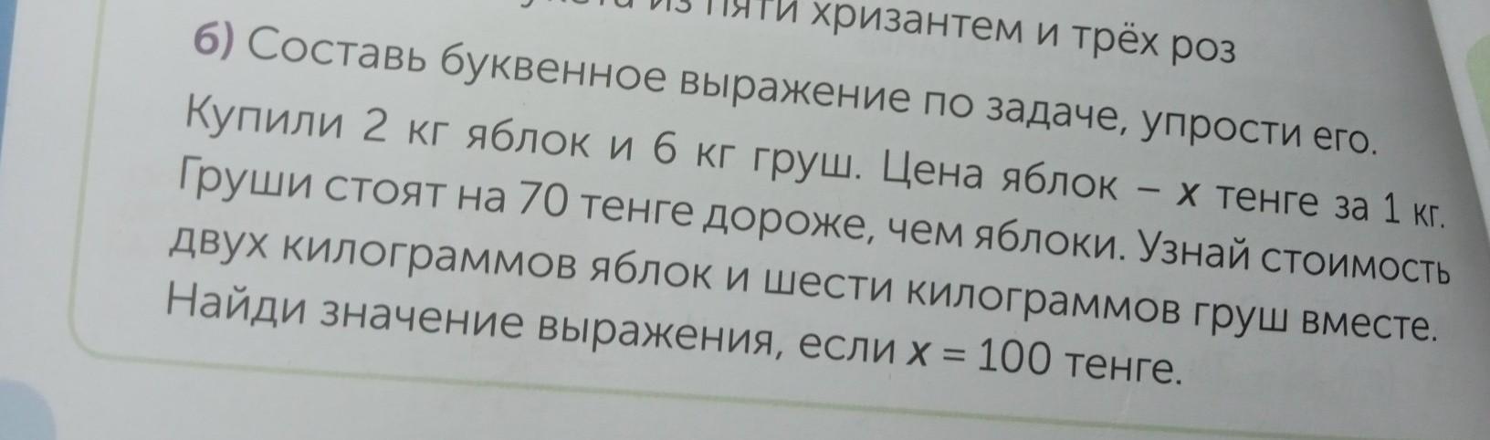 2. Выполни задания. а) Запиши выражения. Цена хризантемы — d тенге за один цветок, а цена одной розы - на 30 тенге больше. • цена розы • стоимость Пяти хризантем • стоимость трёх роз • стоимость букета из пяти хризантем и трёх роз 6) Составь буквенное выражение по задаче, упрости его. Купили 2 кг яблок и6 кг груш. Цена яблок х тенге за 1 кг. Груши стоят на 70 тенге дороже, чем яблоки. Узнай стоимость двух килограммов яблок и шести килограммов груш вместе. Найди значение выражения, если х = 100 тенге.