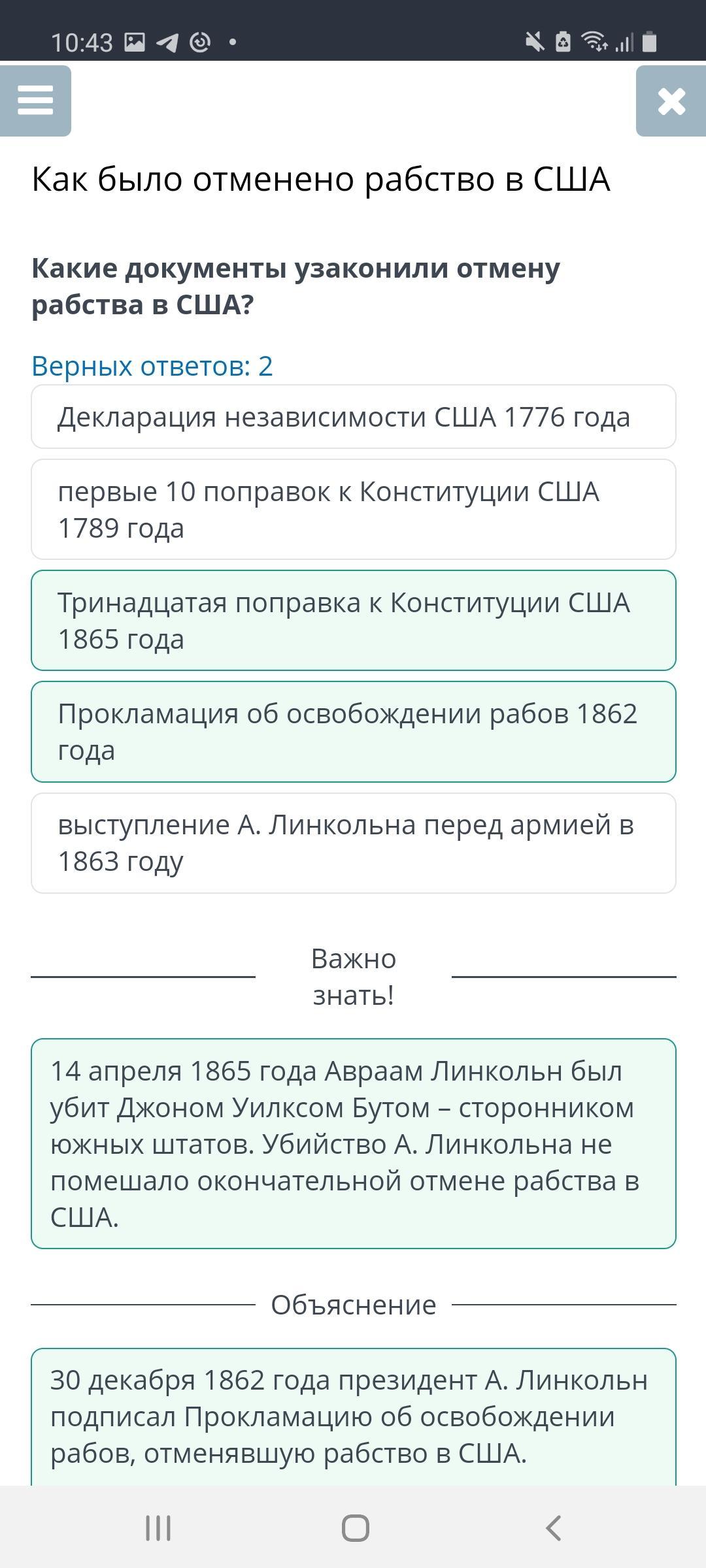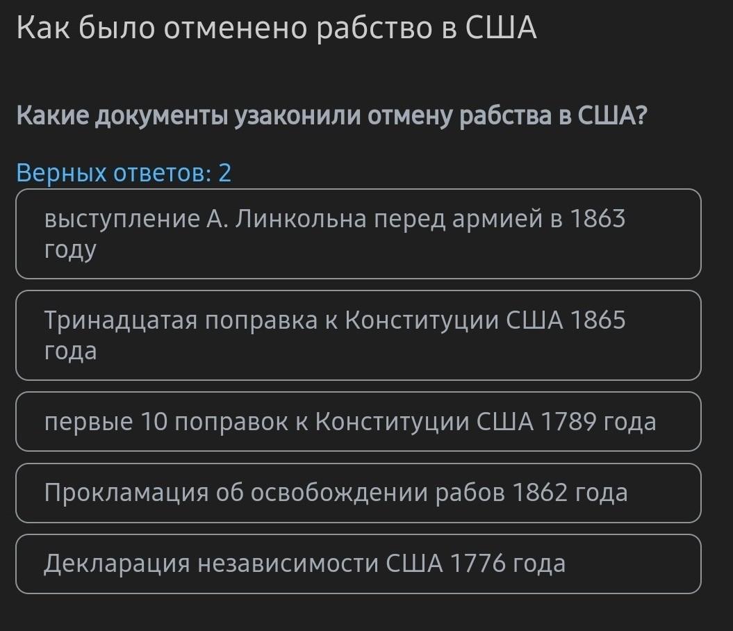 Как было отменено рабство в США Какие документы узаконили отмену рабства в США? Верных ответов: 2 выступление А. Линкольна перед армией в 1863 году Тринадцатая поправка к Конституции США 1865 года первые 10 поправок к Конституции США 1789 года Прокламация об освобождении рабов 1862 года Декларация независимости США 1776 года