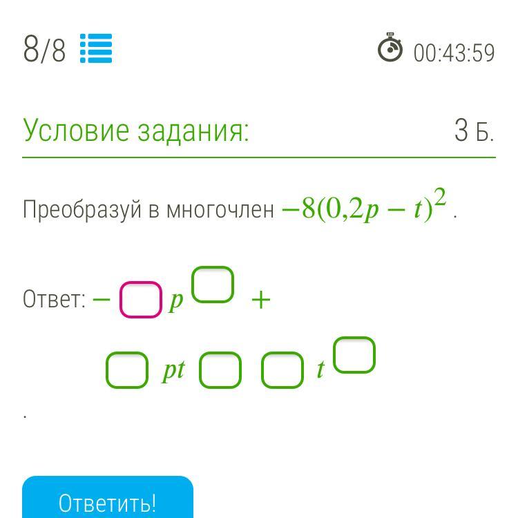 - 8(0,2р - t)² = - 8(0,04p² - 0,4pt + t²) = - 0,32p² + 3,2pt - 8t²