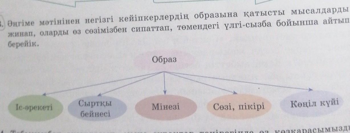 3. Әңгіме мәтінінен негізгі кейіпкерлердің образына қатысты мысалдарды жинап, оларды өз сөзімізбен сипаттап, төмендегі үлгі-сызба бойынша айтып берейік. Образ Іс-әрекеті Сыртқы бейнесі Мінезі Сөзі, пікірі Көңіл күйі