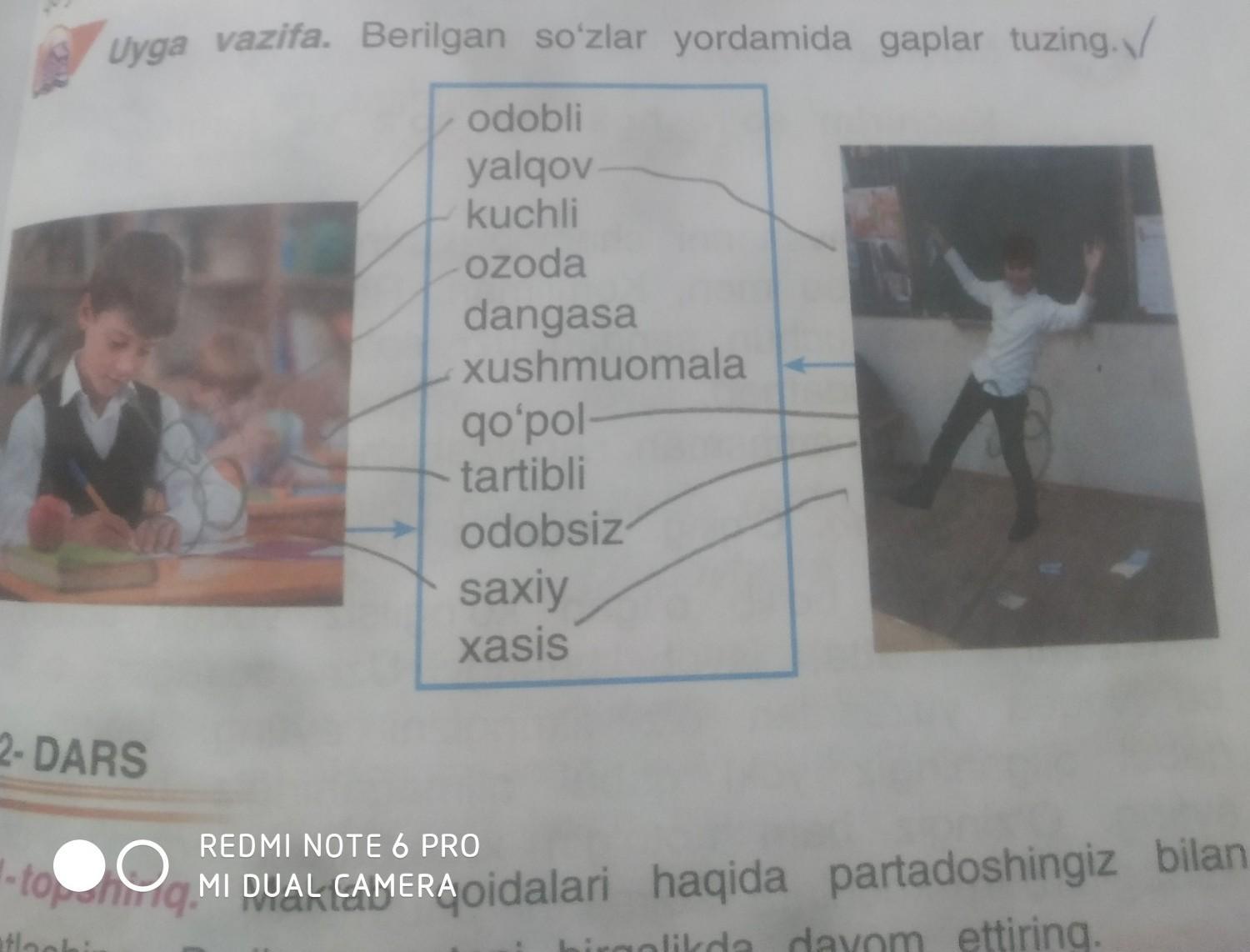 U xasis odam ekan. Ana odobsiz bola. Men tartibli va odobli bolaman. Bizning maxallamizda saxiy odam bor.