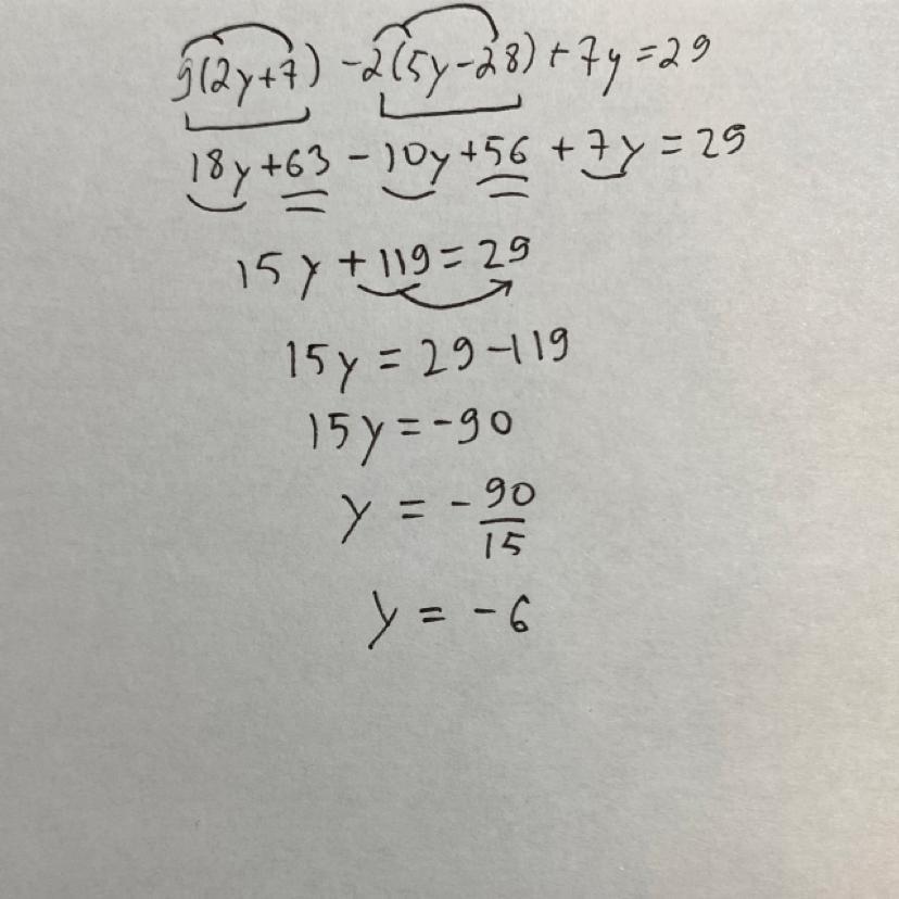 9(2y + 7) - 2(5y - 28) +7y=29, y=-6