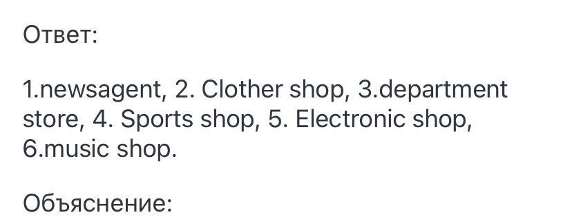 bookshop,chemist,clother shop, department store, electronics shop,musik shop, newsagent, shoe shop, sports ahop, supermarket