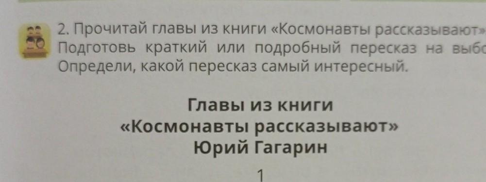 2. Прочитай главы из книги «Космонавты рассказывают». Подготовь краткий или подробный пересказ на выбор. Определи, какой пересказ самый интересный. Главы из книги «Космонавты рассказывают» Юрий Гагарин 1 Детство моё прошло в деревне Клушино, что недалеко от Гжат- ска, в Смоленской области, Шла война. В одной классной комнате одновременно занимались два и третий. третья глава