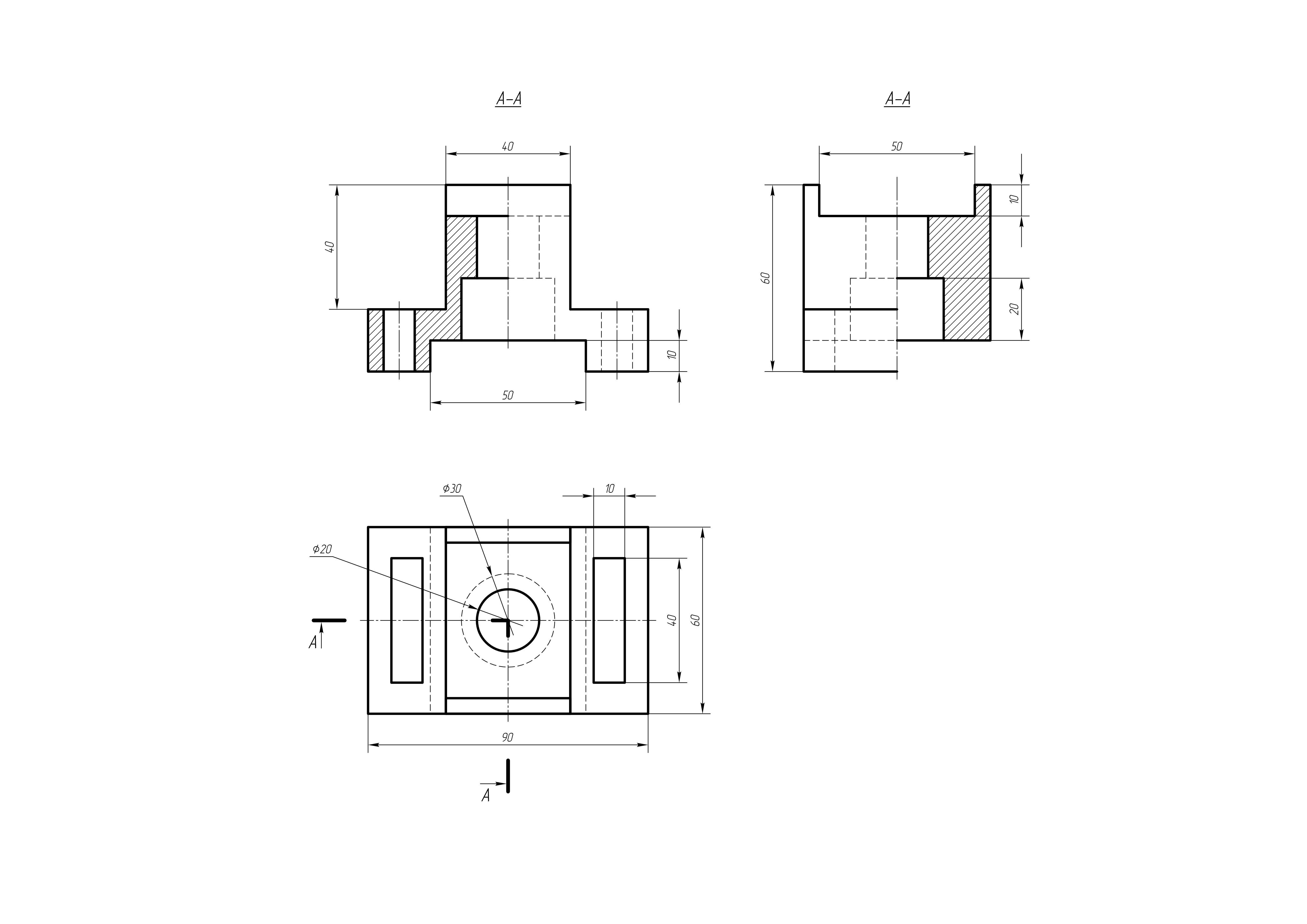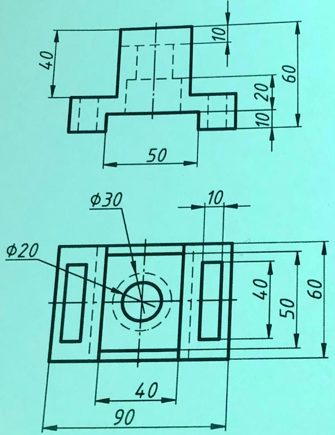 По двум видам детали построить третий, выполнить необходимые разрезы в одной четверти. Поставить размеры.