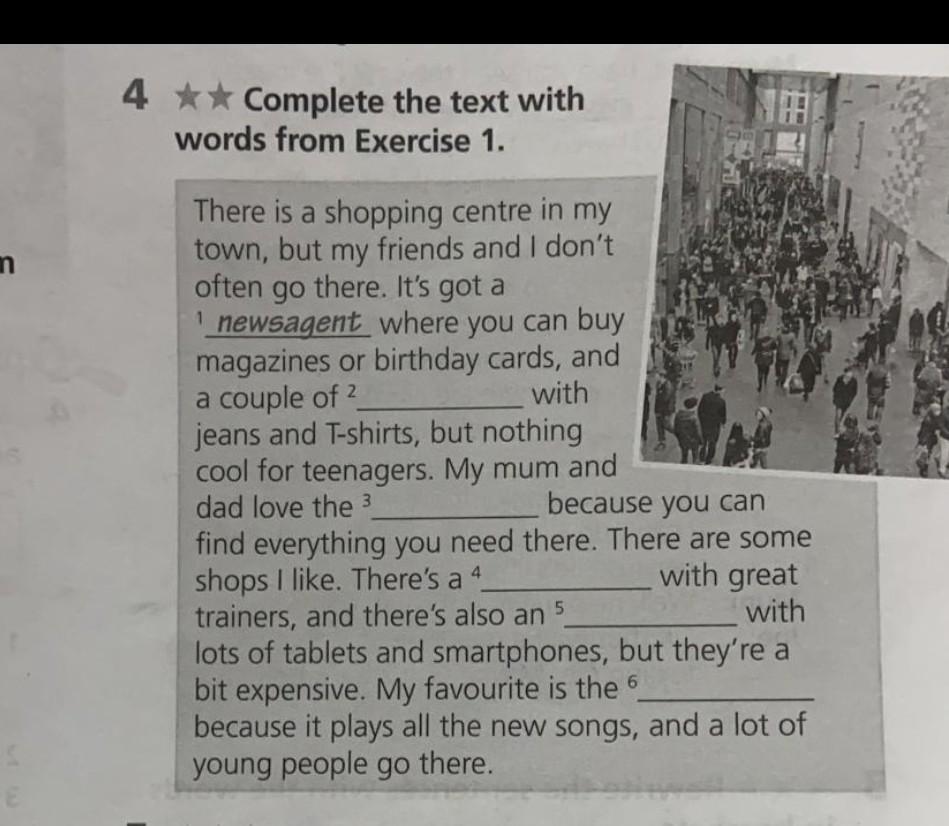 Complete the text with words from Exercise 1 Словы для помощника:book shop, chemist,clother shop, department shop, electronics shop, music shop, newsagent,shoe shop.sports shop, supermarket