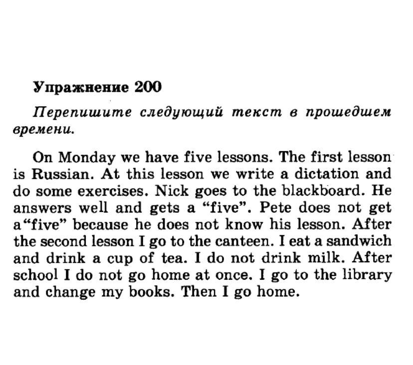 On Monday we had five lessons. The first lesson was Russian. At this lesson we wrote a dictation and did some exercises. Nick went to the blackboard. He answered well and got a “five”. Pete didn’t get a “five” because he didn’t know this lesson. After the second lesson I went to the canteen. I ate a sandwich and drank a cup of tea. I didn’t drink milk. After school I didn’t go home at once. I went to the library and changed my books. Then I went home.