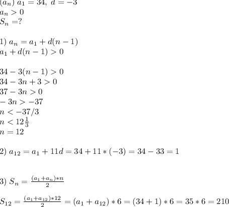 Арифметическая прогрессия задана а1= 34, d =-3. Найди сумму положительных членов этой прогрессии.