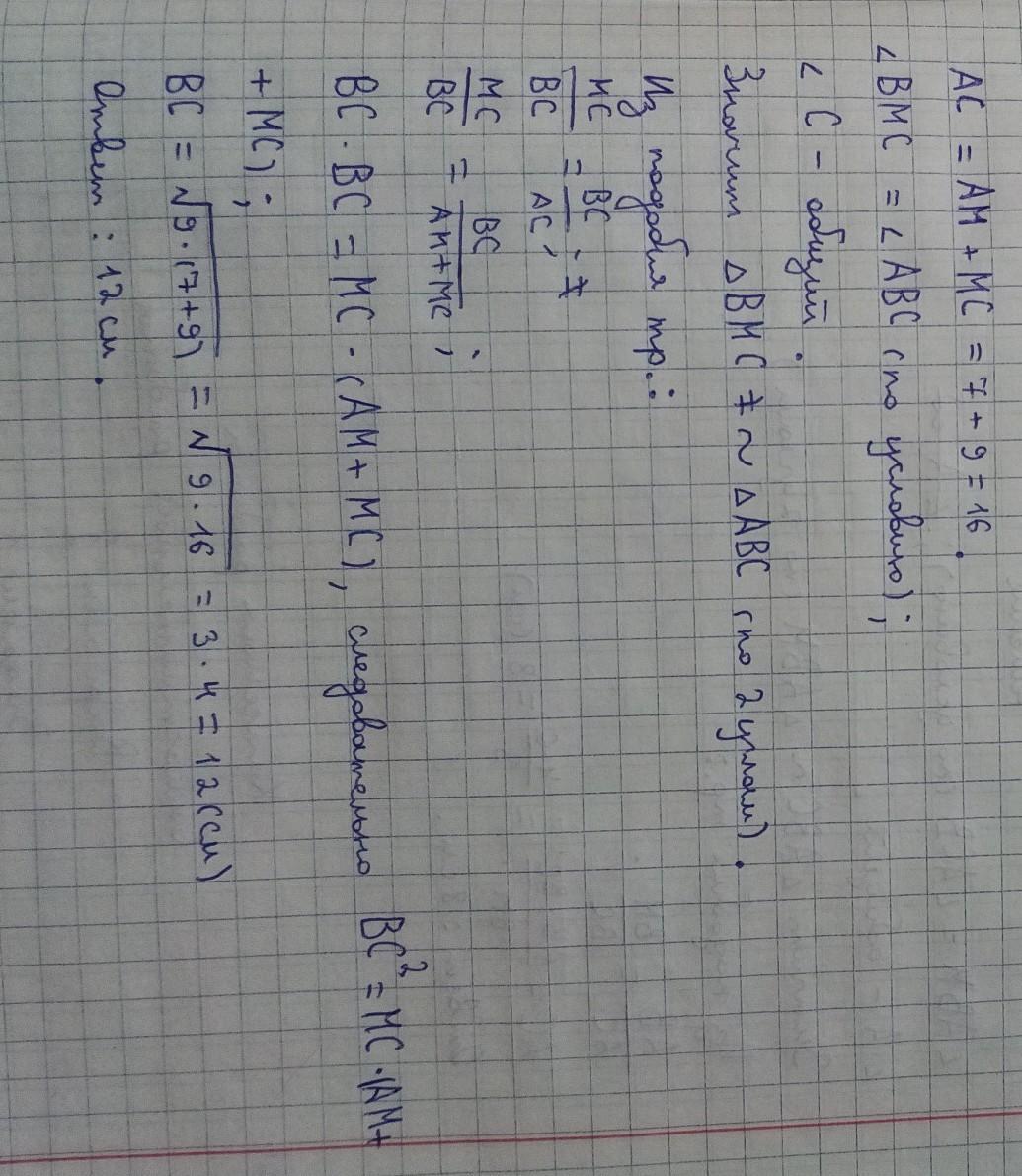 Дано: треугольник ABC, M принадлежит AC, угол BMC= углу ABC, AM=7см,MC=9 см