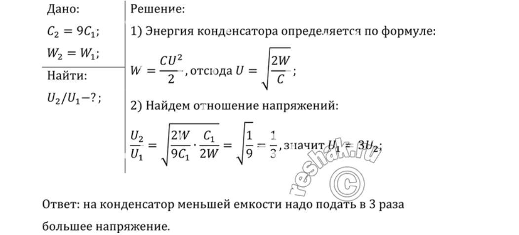 4. Емкость одного конденсатора в 9 раз больше емкости другого. На какой из этих конденсаторов надо подать больше напряжения, чтобы их энергия была одинаковой? Во сколько раз больше?