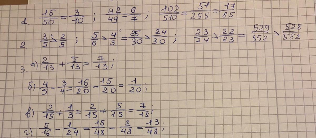 3. Вычислите: а) 2/13+5/13 б) 4/5-3/4 в) 2/15+1/3 г) 5/16-1/24