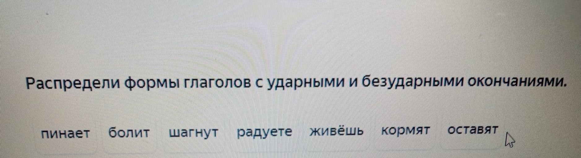 распредели формы глаголов с ударными и безударными окончаниями пинает болит шагнуть радуйте живёшь кормят оставят