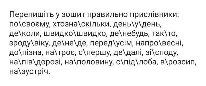по-своєму, хтозна-скільки, день-у-день, деколи, швидко-швидко, де-небудь, так-то, зроду-віку, де-не-де, передусім, напровесні, допізна, натроє, спершу, дедалі, зісподу, на півдорозі, наполовину, спідлоба, врозсип, назустріч