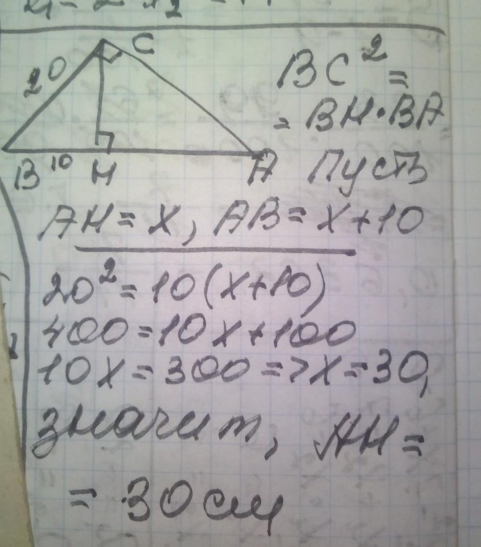 В прямоугольном треугольнике ABC с прямым углом С и катетом СВ=20 см проведена высота СН,ВН=10 см.Найдите АН