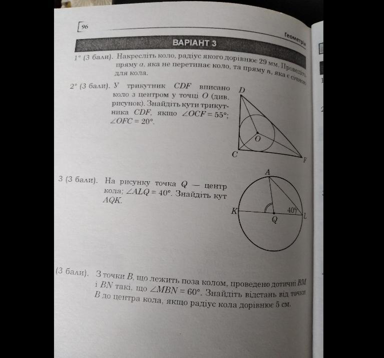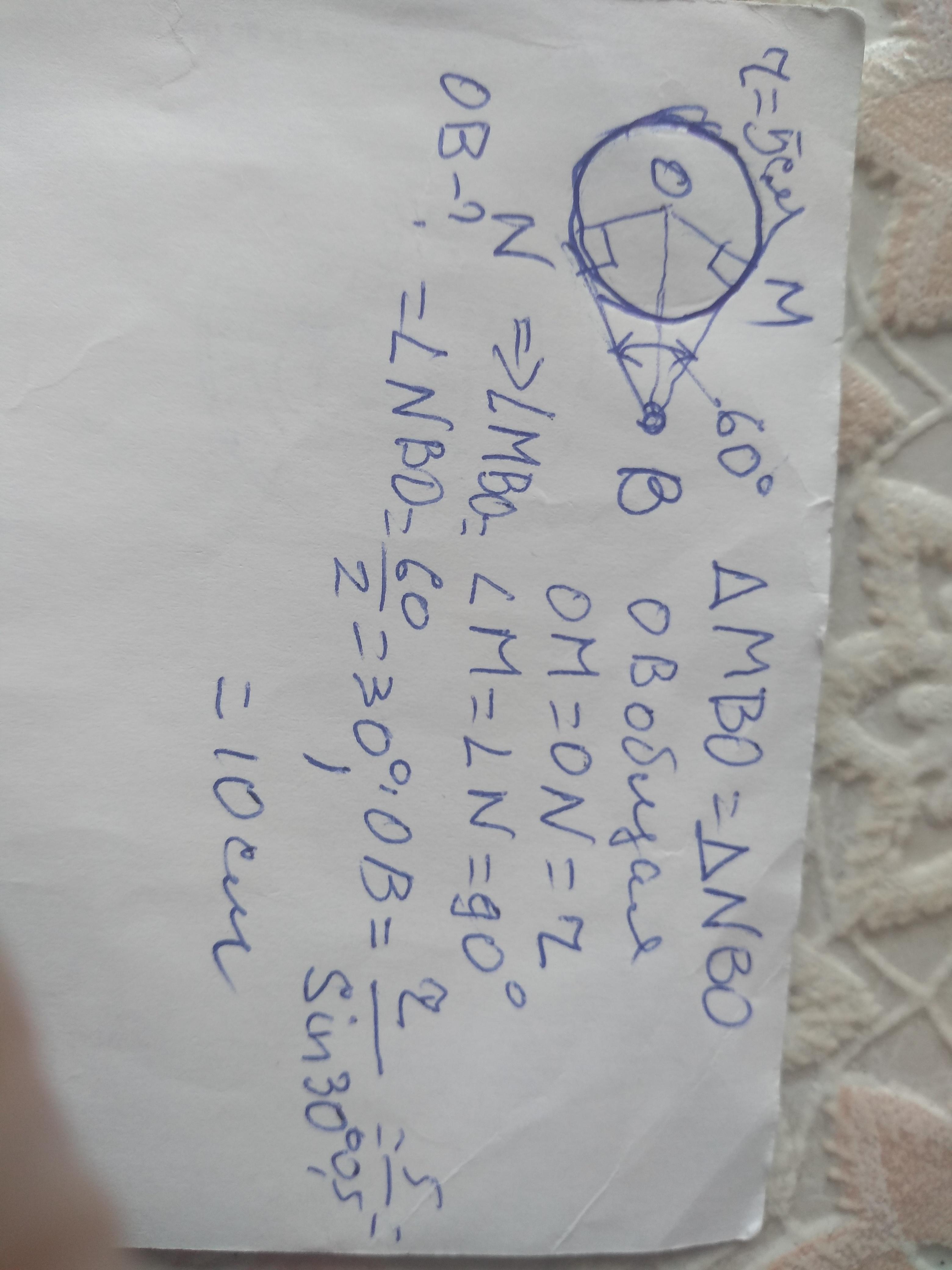 З точки в що лежить поза колом, проведено дотичні. ВМ i BN такі, що MBN=60° . Знайдить відстань від точки В до центра кола, якщо радіус кола дорівнюе 5 см.( 4 завдання)