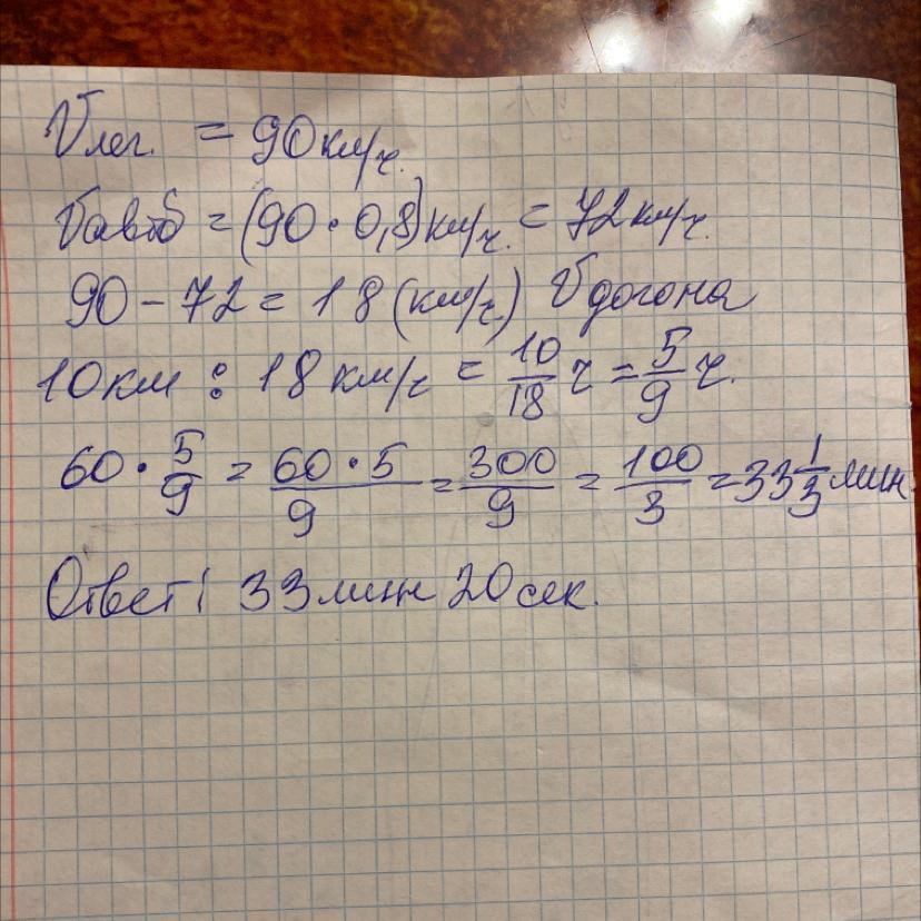 После того, как автобус проехал 10 км, вслед за ним поехала легковая машина со скоростью 90 км/ч. Скорость автобуса составляет 80% скорости легковой машины. Через сколько времени легковая машина догонит автобус? Дайте ответ в часах и в минутах.