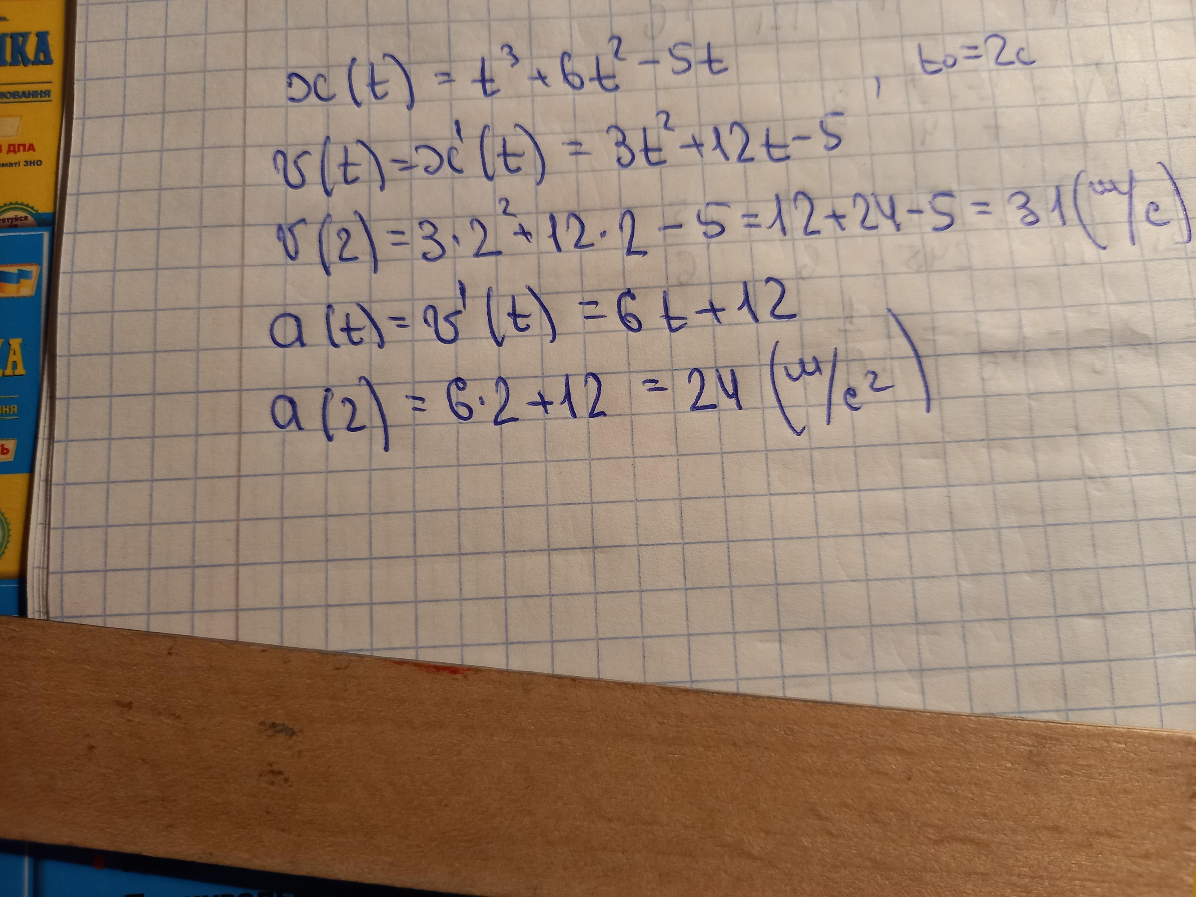 (x - в метрах, t - в секундах) Знайдіть швидкість та прискорення в момент часу