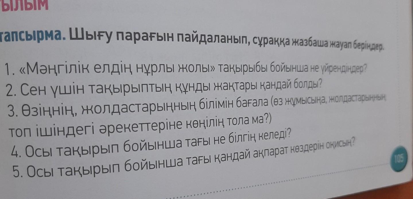 1-тапсырма. Шығу парағын пайдаланып, сұраққа жазбаша жауап 1. «Мәңгілік елдің нұрлы жолы» тақырыбы бойынша не үйрендің, 2. Сен үшін тақырыптың құнды жақтары қандай болды? 3. Өзіңнің, жолдастарыңның білімін бағала (өз жұмысыңа, жолдас Топ ішіндегі әрекеттеріне көңілің тола ма?) 4. Осы тақырып бойынша тағы не білгің келеді? 5. Осы тақырып бойынша тағы қандай ақпарат көздерін оқисың