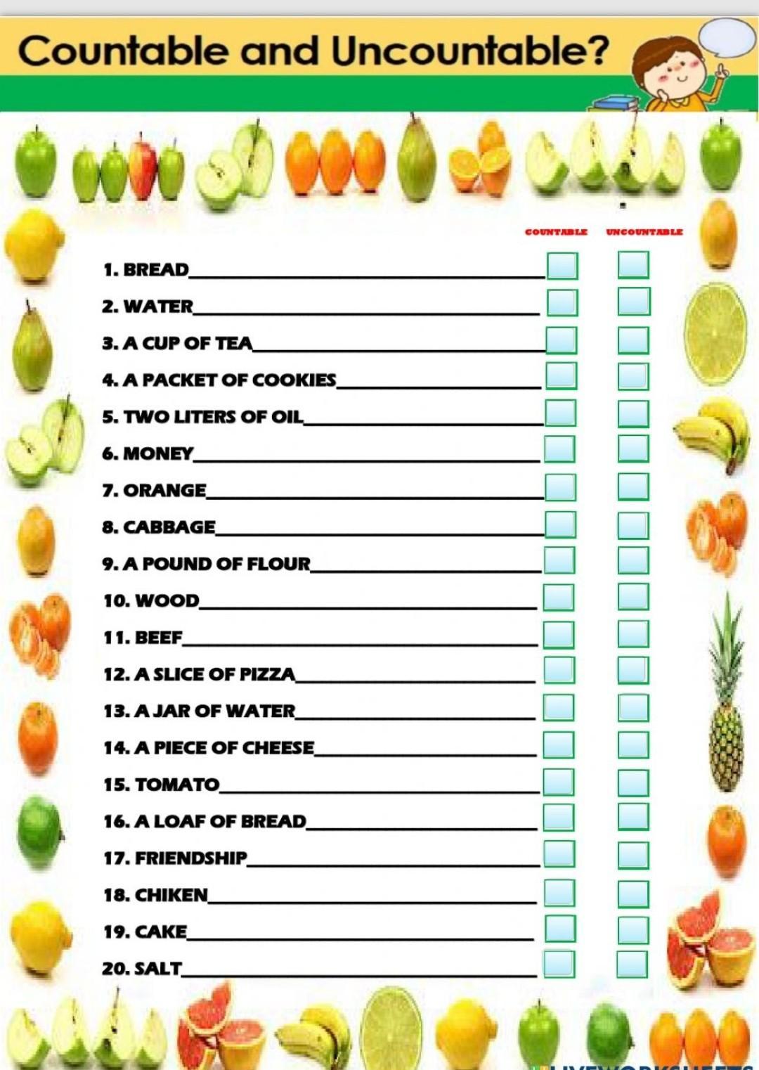 Countable and Uncountable? 0 000 ( Love COUNTABLE UNCOUNTABLE 1. BREAD 2. WATER 3. A CUP OF TEA 4. A PACKET OF COOKIES 5. TWO LITERS OF OIL 6. MONEY 7. ORANGE 8. CABBAGE 9. A POUND OF FLOUR 10. WOOD 11. BEEF 12. A SLICE OF PIZZA_ 13. AJAR OF WATER 14. A PIECE OF CHEESE 15. TOMATO 16. A LOAF OF BREAD 17. FRIENDSHIP 18. CHIKEN 19. CAKE 20. SALT