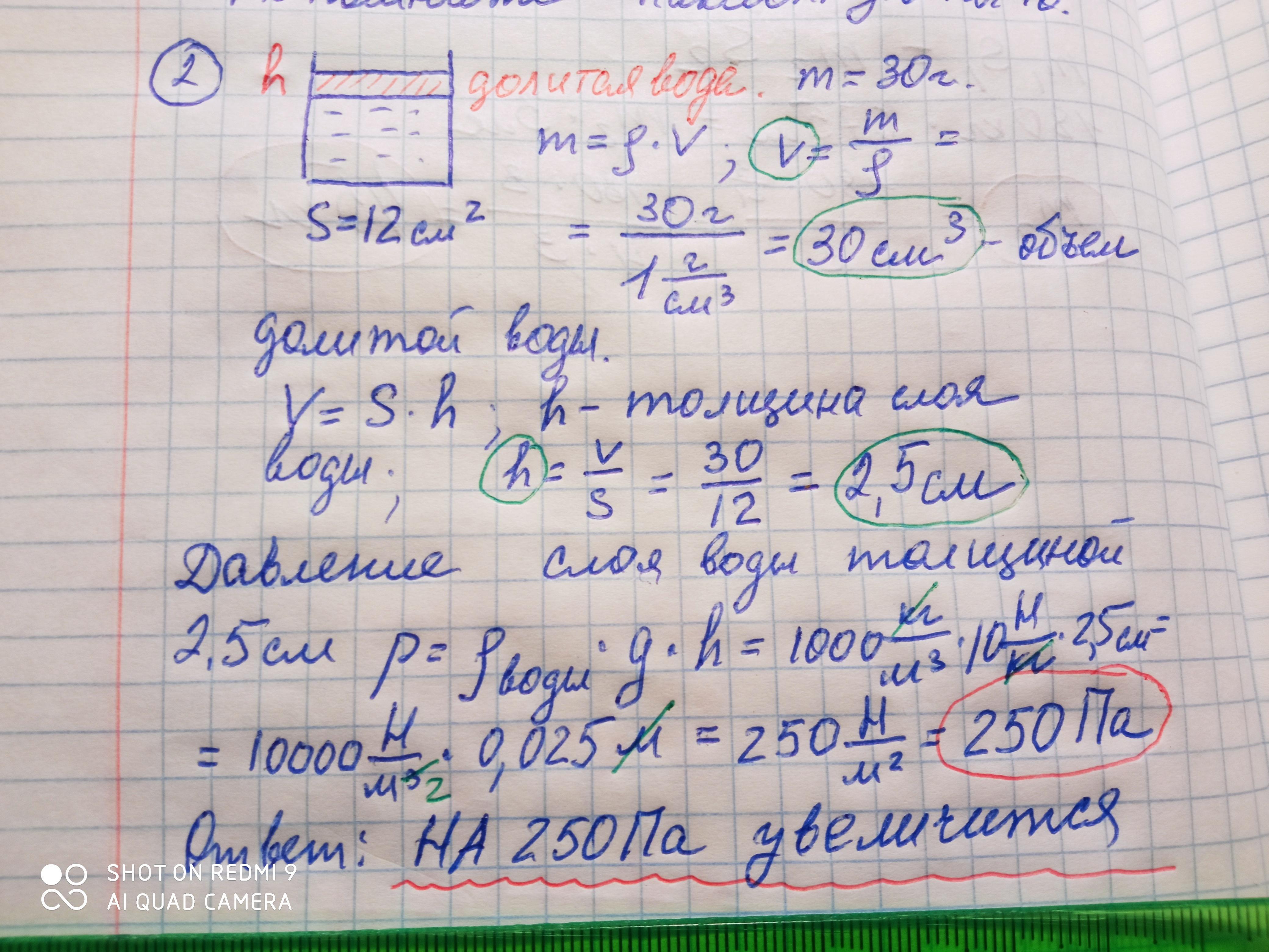 2. На сколько увеличится давление на дно цилиндрической мензурки, если долить в неё 30 грамм воды? Площадь дна мензурки 12 см2