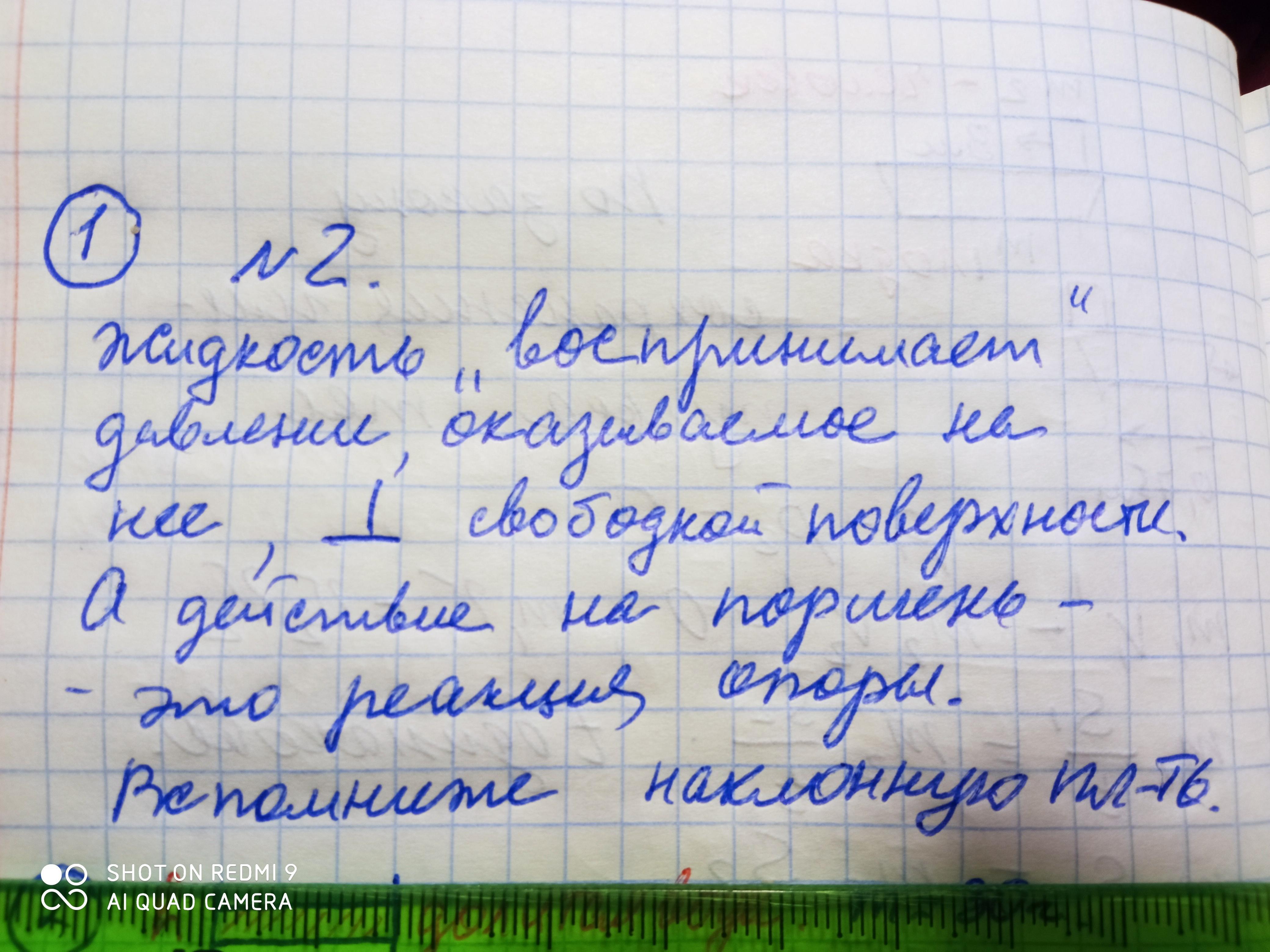 1. Жидкость в сосуде находится в равновесии под массивным косым поршнем. В каком направлении жидкость действует на малый участок поршня вблизи точки А? (см. изображение)