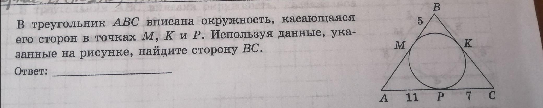 по свойству отрезков касательных, проведенных из точки В к окружности, ВМ =ВК=7, а из точки С СР=СК=5; ВС =ВК+СК=7+5=12