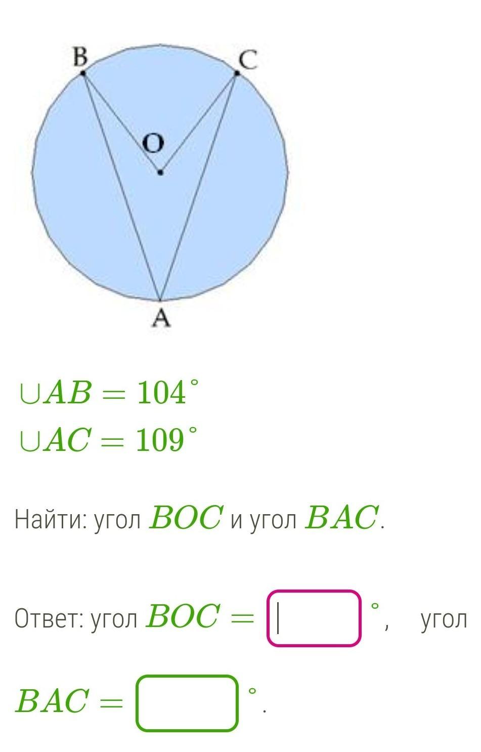 ∪ВС = 360° - ∪АВ - ∪АС = 360° - 104° -109° = 147°