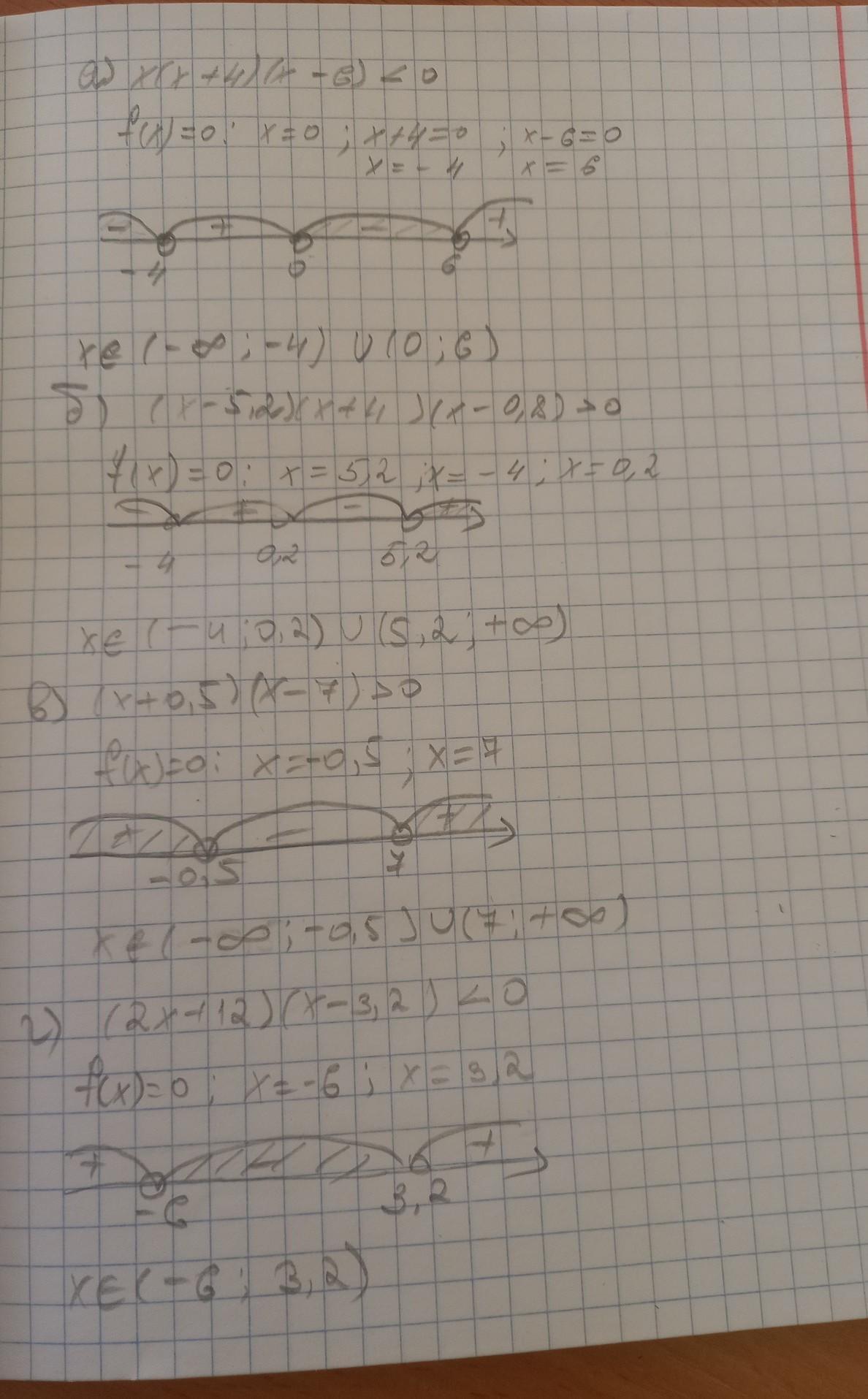 Самостоятельная работа 1 вариант Решить неравенство методом интервалов: а) х(х + 4)(х – 6) < 0; б) (х – 5,2)(х + 4)(х – 0,8) > 0; в) (х + 0,5)(х - 7) > 0; г) (2x + 12)(х – 3,2) < 0. д) 2x2 + 5х + 2 > 0