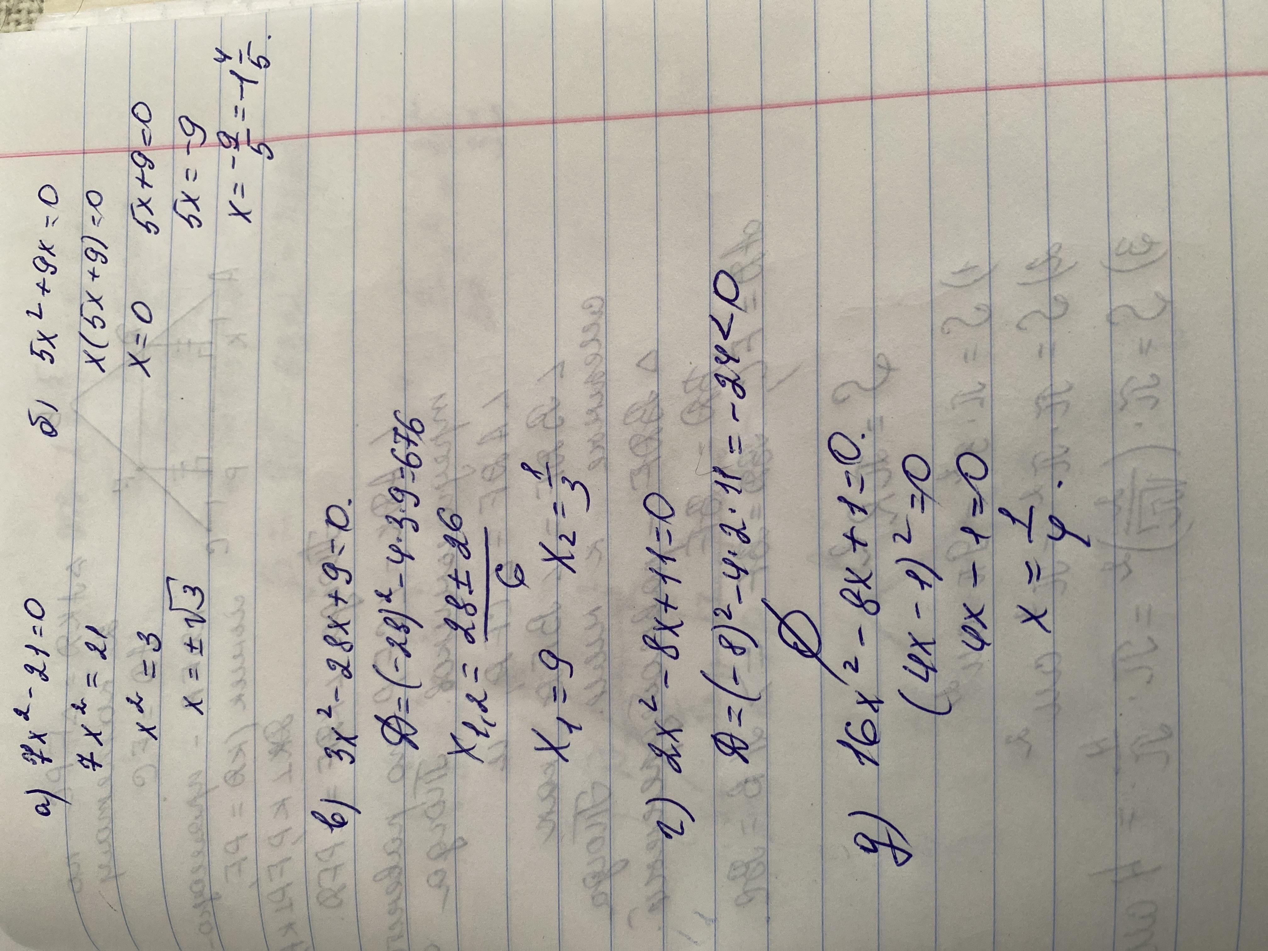 1. Розв’яжіть рівняння: а)7 2 − 21 = 0; б) 5 2 + 9 = 0; в) 3 2 − 28 + 9 = 0; г) 2 2 − 8 + 11 = 0; д) 16 2 − 8 + 1 = 0.