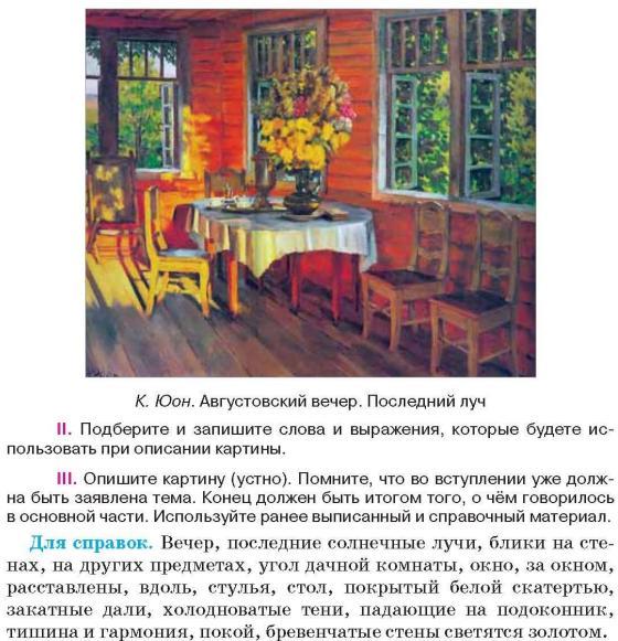 На картине автор изобразил террасу родного дома в предвечерней суете. Лучи солнца, которое вот-вот спрячется за горизонт, освещают деревянный пол и мебель, красивые цветы на столе и просто наполняют комнату светом и радостью. В центре картины стоит большой стол, на котором покрыта белая скатерть. На столе мы видим подготовку к чаепитию: самовар, наполненный, чаем и возле него чашки. Также наше внимание приковывает к себе шикарный букет цветов. В нем находятся цветы разных форм и оттенков. Глядя на такую красоту, даже, кажется, что ощущаешь сладкий запах, распространяющийся по всей террасе. Возле всех окон и около стола стоят стулья, это свидетельствует о том, что автор любил принимать много гостей такими теплыми летними вечерами. За окнами виднеется сад. Деревья автор изобразил темно-зеленными, наверное, в доказательство того, что лето еще не готово отступать.