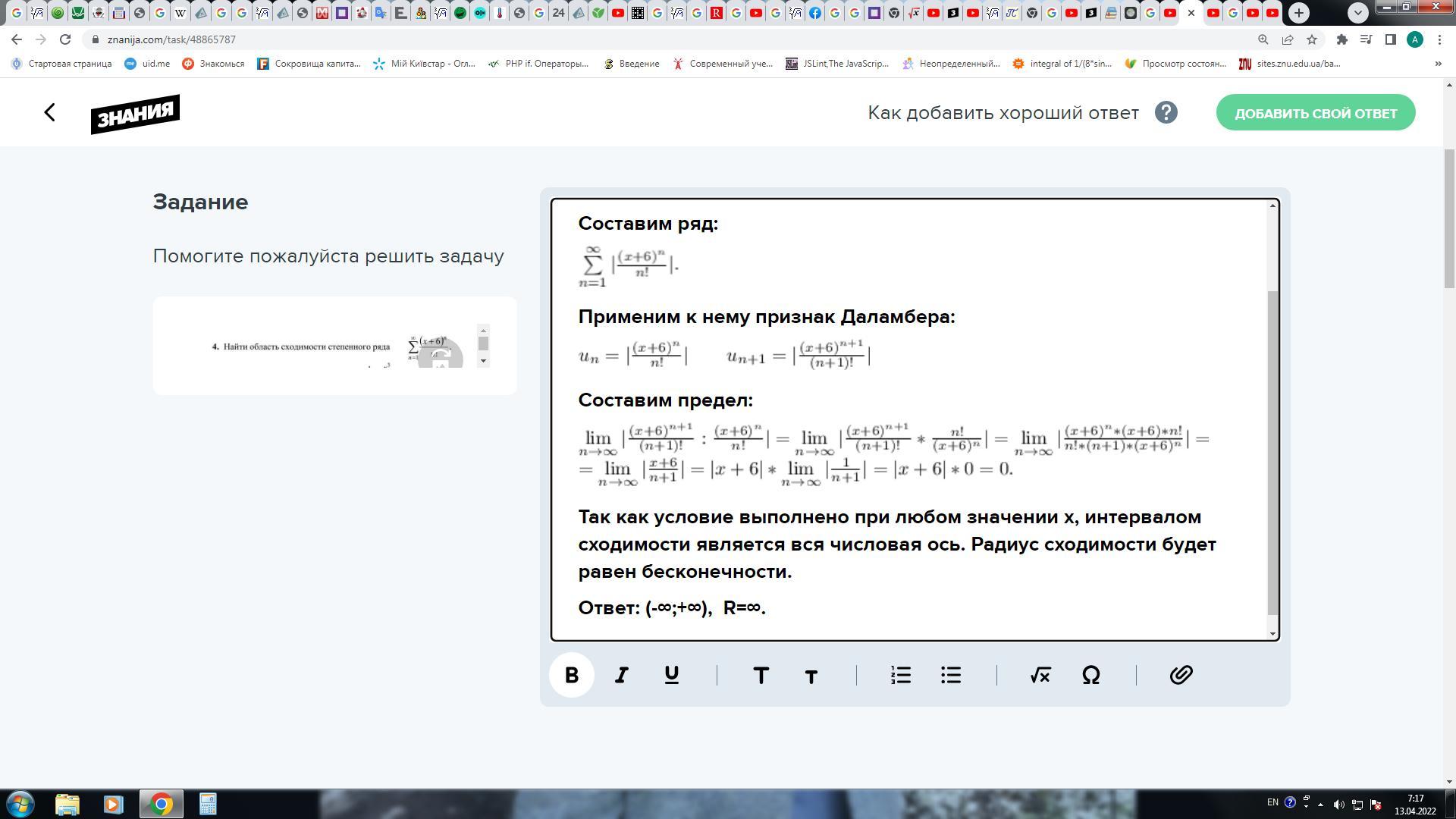 Так как условие выполнено при любом значении х, интервалом сходимости является вся числовая ось. Радиус сходимости будет равен бесконечности.