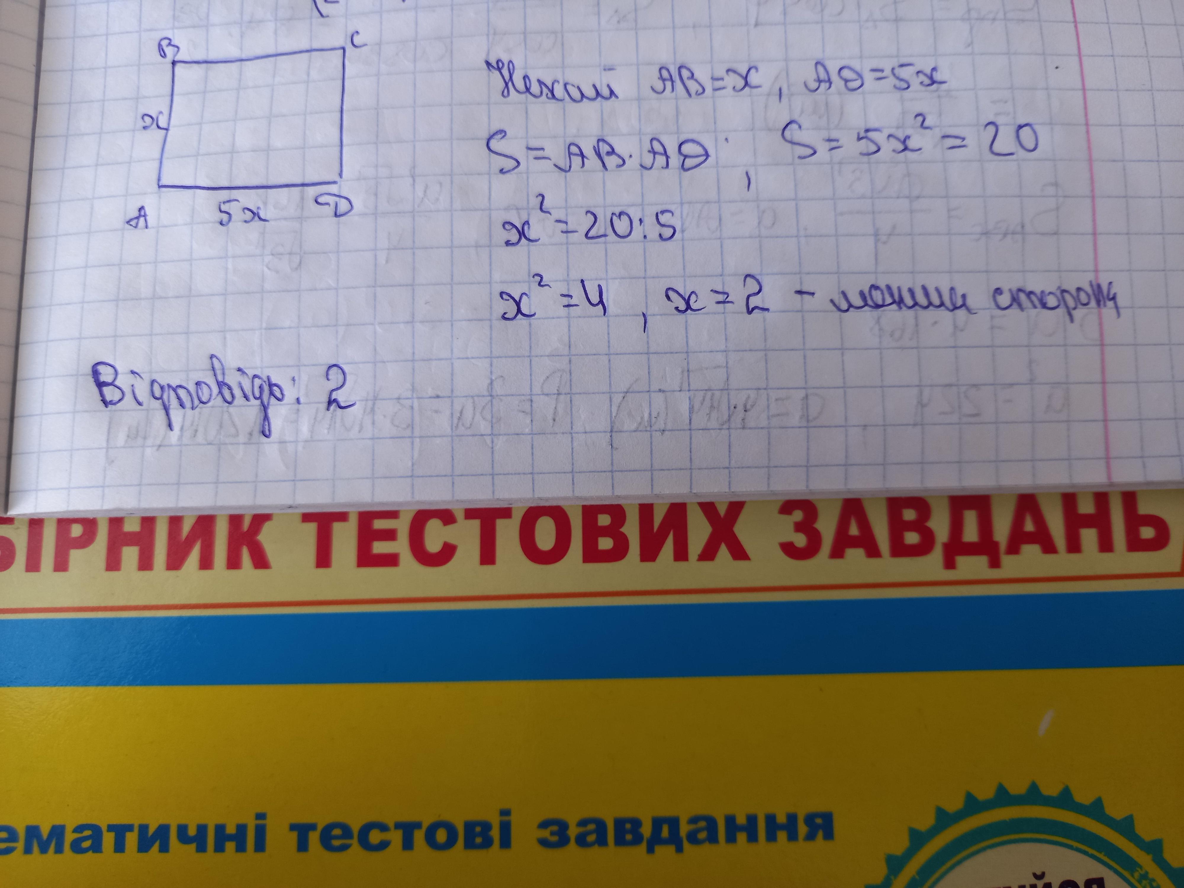 Сторони прямокутника відносяться, як 1 : 5, а його площа дорівнює 20. Знайдіть найменшу сторону прямокутника.