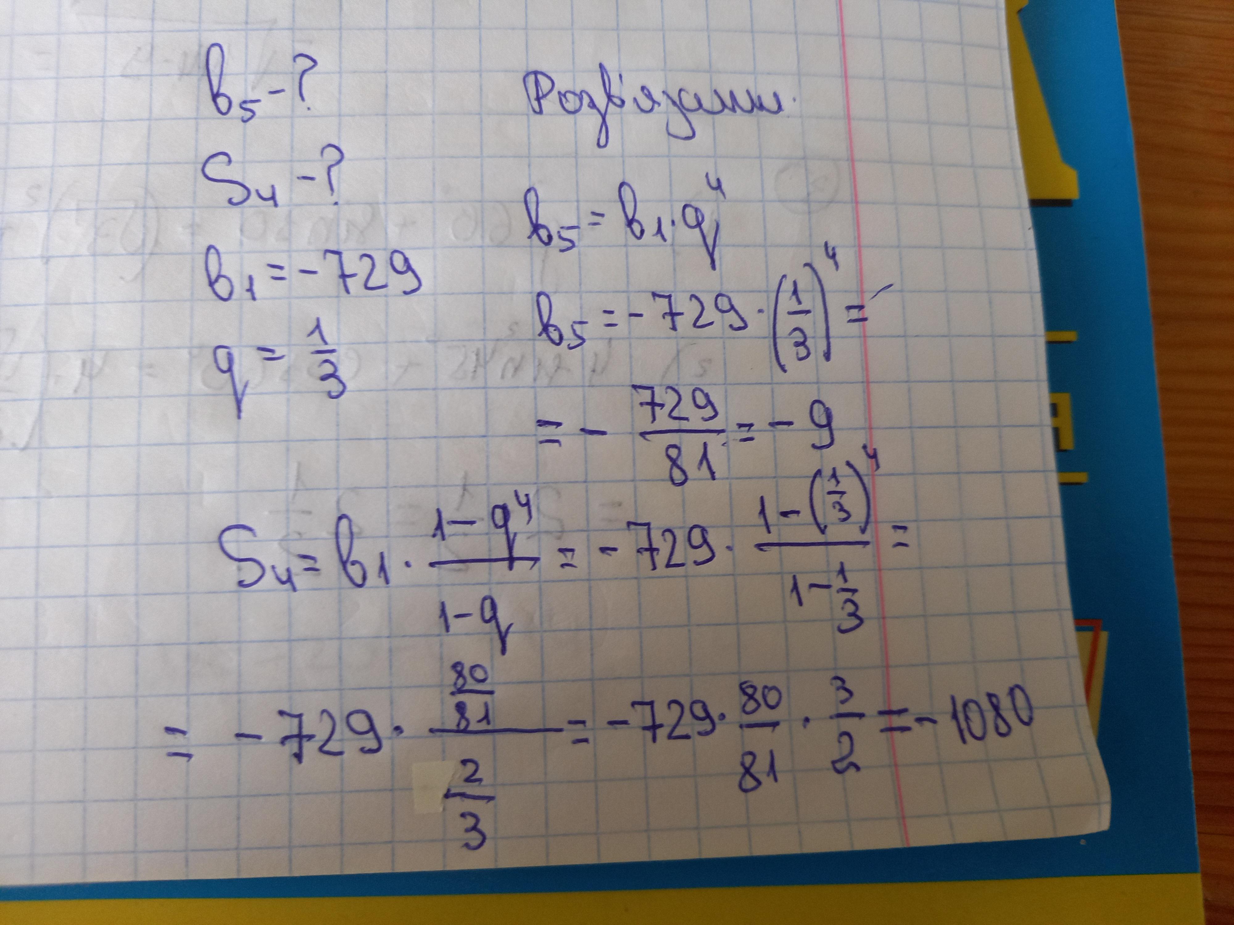 6. Знайдіть п'ятий член і суму чотирьох перших членів геометричної прогресії (b), яка b1= -729, q=1/3