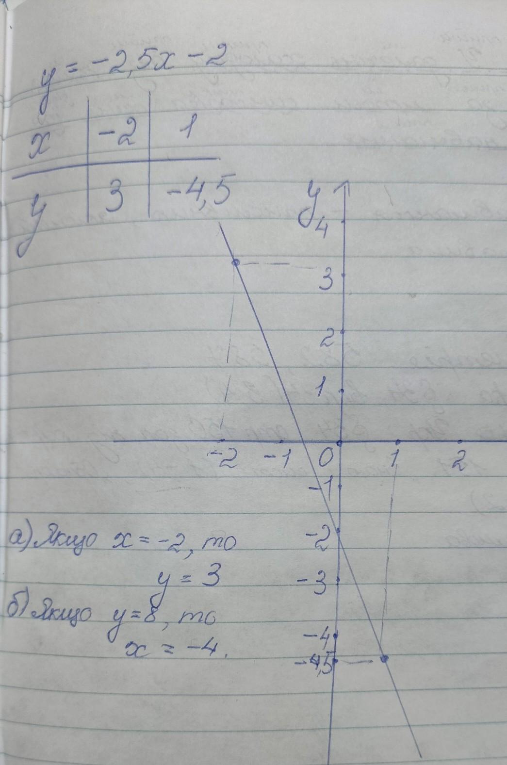 Побудуй графік функцій У= -2,5Х-2. Визнач за графіком: