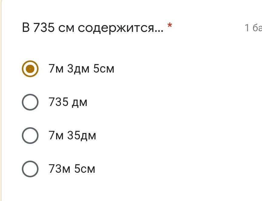 В 735 см содержится... * 1 балл 7м Здм 5см 735 дм 7м 35дм 73м 5см. помогите пожалуйста то что я отметила необрощайте внимание