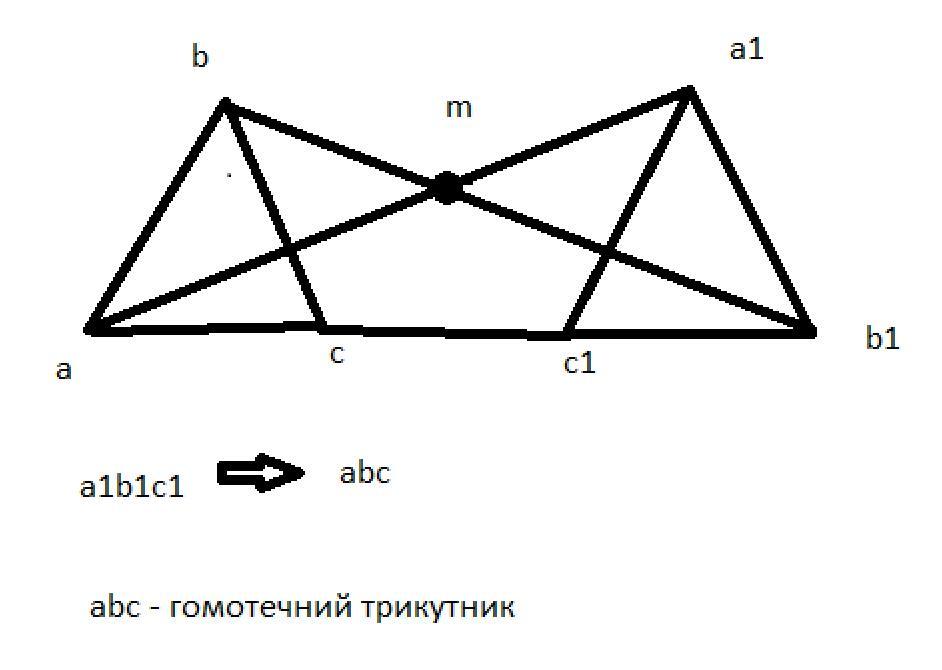 Накресліть трикутник ABC і позначте точку M яка лежить поза трикутника ABC . Побудуйте трикутник A1 B1 C1 гомотечний даному з центром гомотетії в точці M коефіцієнтом k=2