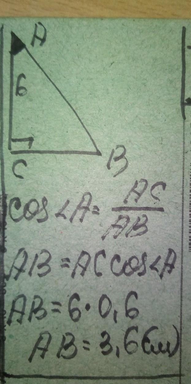трикутнику АВС <С = 90°. Знайдіть AB, якщо АС = 6 см і сов А = 0,6
