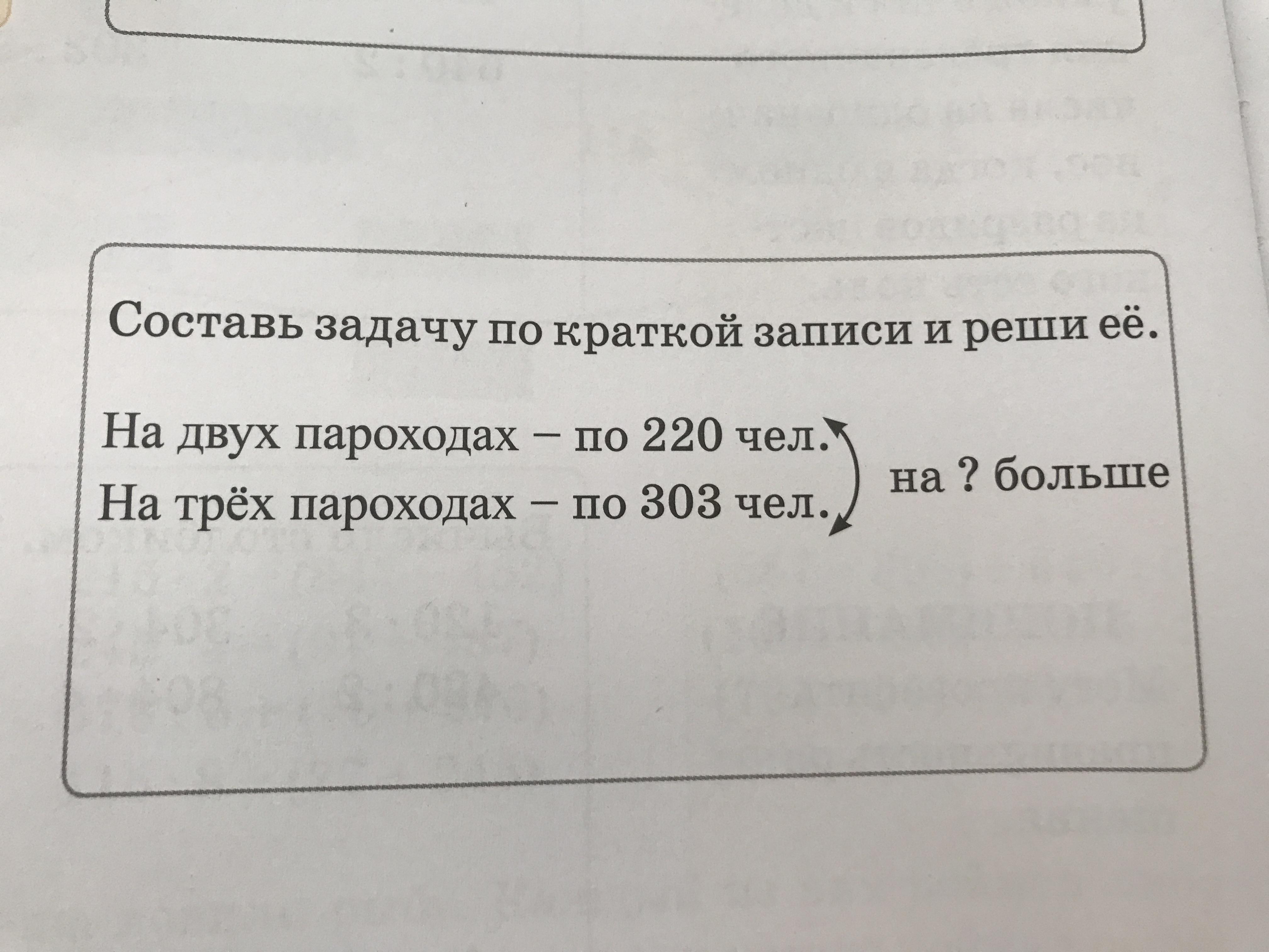 ЗАДАЧА: В Море плавали пароходы. В двух-по 220 человек. В трёх- 303 человек. На сколько больше человек?