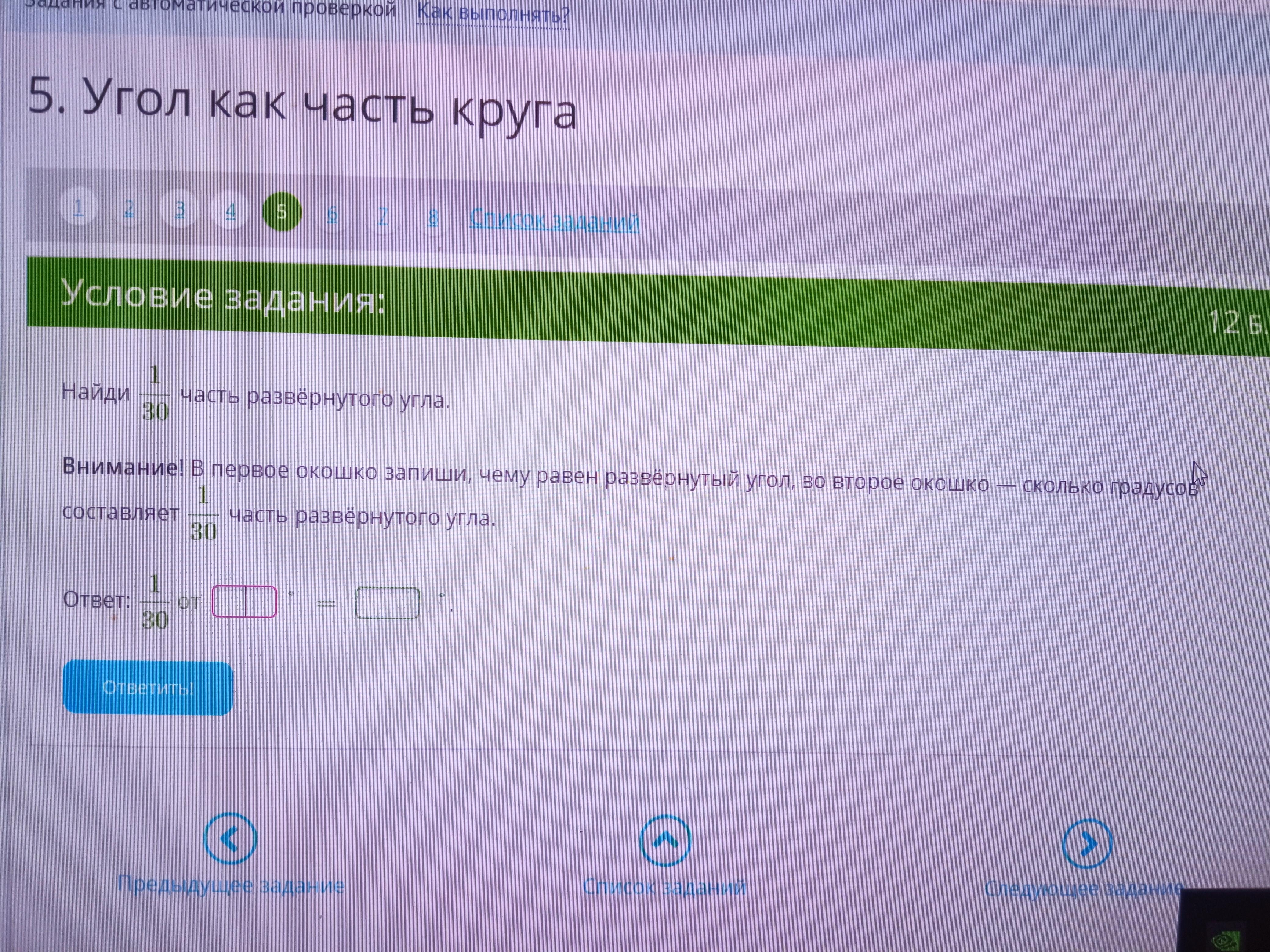 Пошаговое объяснение: Развернутый угол равен 180°, 180° разделим на 30 получится 6°