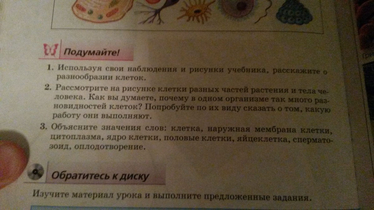 Рассмотрите на рисунке клетки разных частей растения и тела человека... на фото продолжение задания и картинка