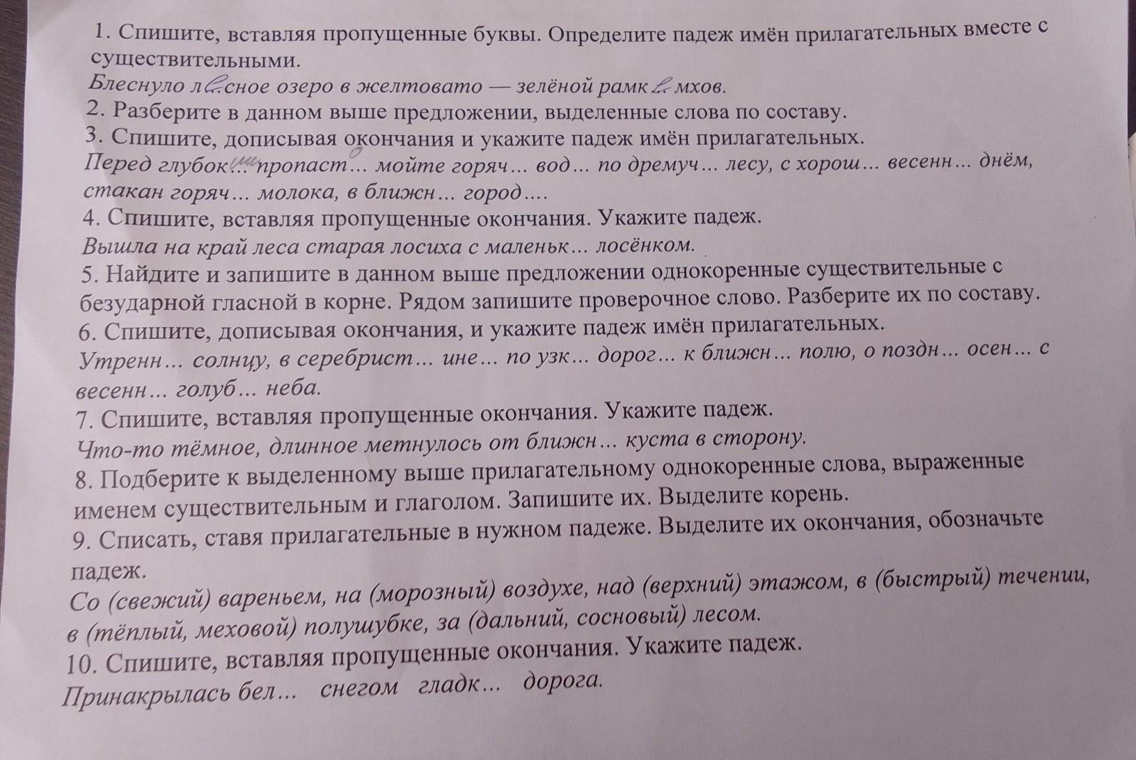 спишите вставляя пропущенные буквы определите падеж имён прилагательных вместе с существительными в лесное лесное озеро в желтовато зелёные рамки на разберите в данном выше предложении выделенные слова по составу спишите дописывая окончания и укажите падеж имён прилагательных перед глубоким просторным мойки горячей водой по дремучему лесу с хорошим весенним днём стакан горячего молока ближний город спишите вставляя пропущенные окончания укажите падеж вышла на край леса старая лосиха с маленьким лосенком. найдите и запишите в данном выше предложениях однокоренные существительные с безударной гласной в корне рядом запишите проверочное слова разберите их по составу спишите дописывая окончания и укажите падеж имён прилагательных утерянное солнце серебристая имя по-русски дорогу к ближнему полю и поздней осенью с синим голубым небом спишите вставляя пропущенные окончания укажите падеж что-то тёмное длинное тянулась от ближнего света в сторону подберите к выделенному выше прилагательному однокоренные слова выражение имён существительных и глаголов запишите их выделите корень списать вставить прилагательные прилагательные в нужном падеже выделите их окончания обозначая падеж всё свежее вареньем на морозном воздухе над верхним этажом в быстрый течение В тёплый меховой полушубки заданий основой лесом спишите вставляя пропущенные окончания укажите падеж принакрылась Белым снегом гладкая дорога
