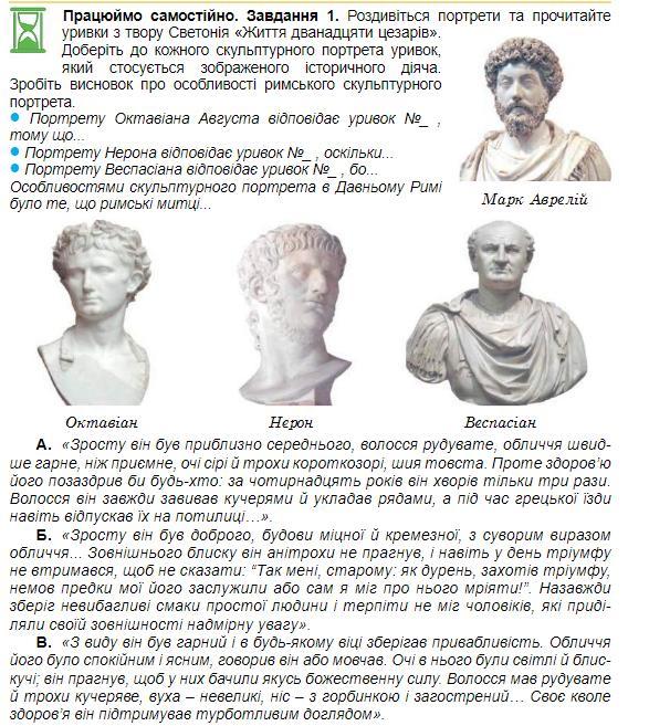 • Портрету Нерона відповідає уривок №А, оскільки волосся він завжди завивав кучерями й укладав рядами, а під час грецької їзди навіть відпускав їх на потилиці.