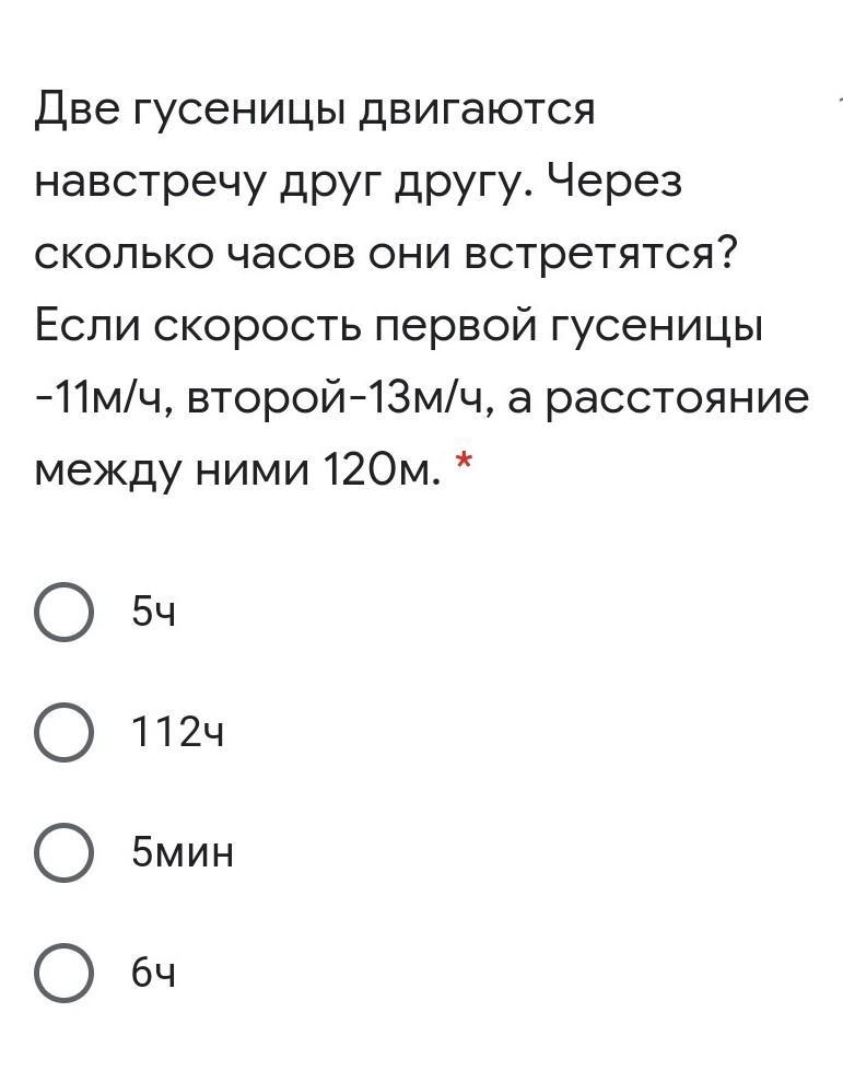 1 балл Две гусеницы двигаются навстречу друг другу. Через сколько часов они встретятся? Если скорость первой гусеницы -11м/ч, второй-13м/ч, а расстояние между ними 120м. 5ч 1124 5мин бч
