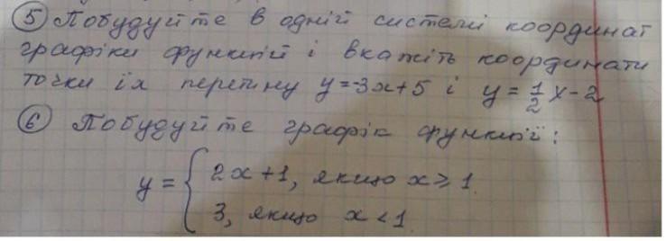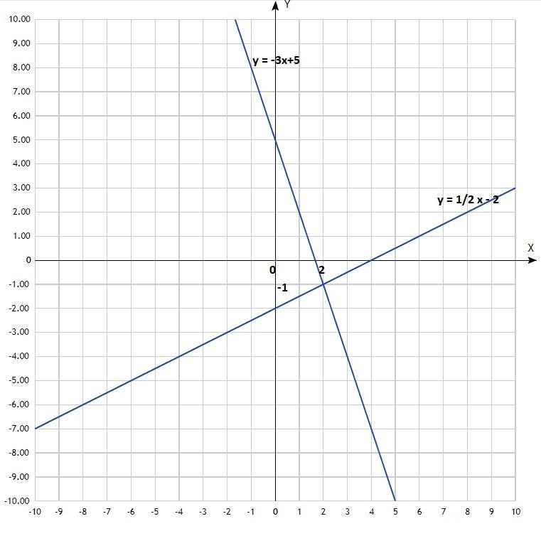 Построить графики функций у = -3х + 5 и у = 1/2 х - 2; найти координаты точки их пересечения.
