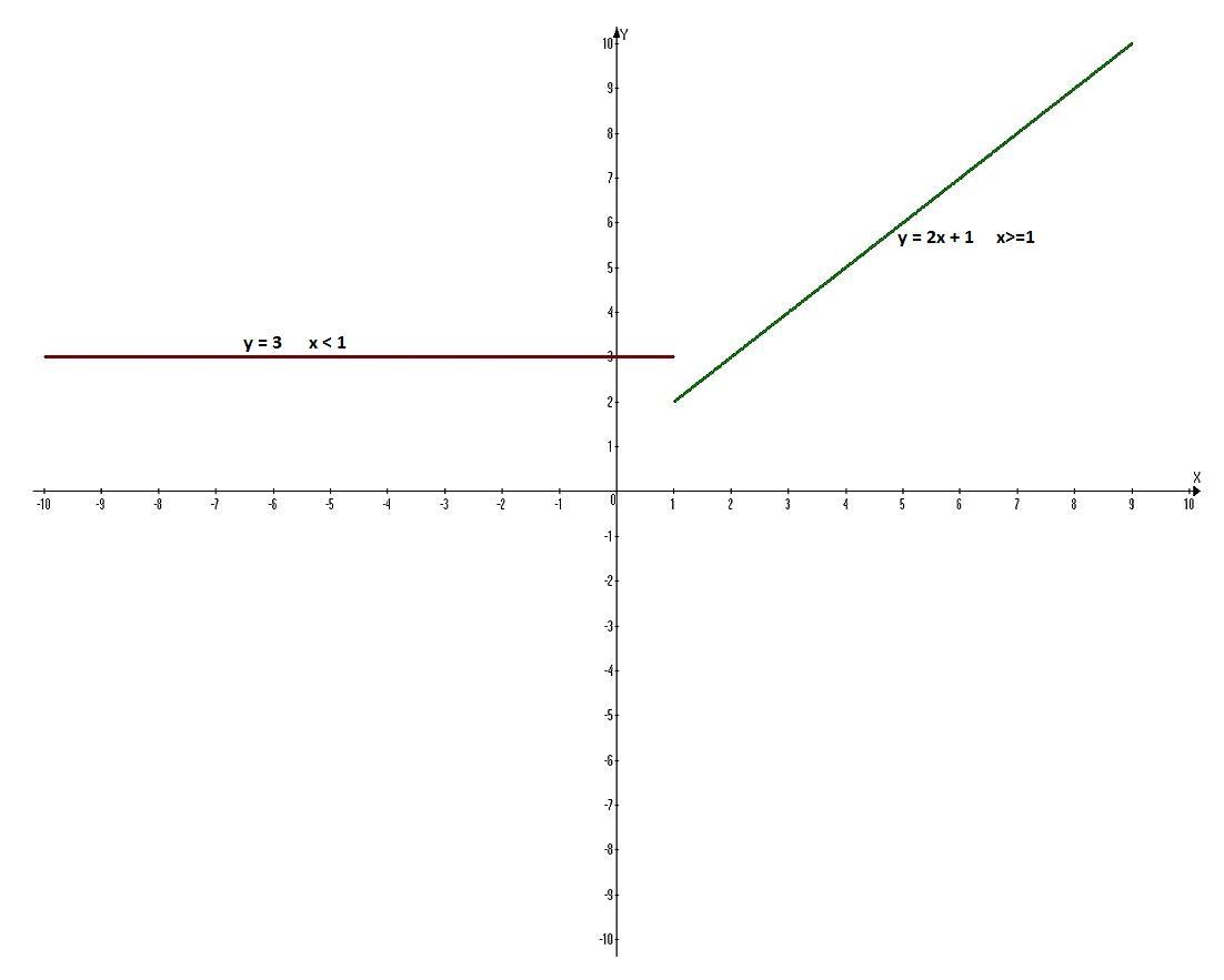 Так как по условию значения х >= 1 и х < 1, график состоит из двух прямых.